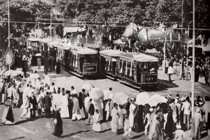 افتتح اول خط ترام كهربائى فى مصر سنة 1896 والصورة من احتفال تشغيل المحطة المركزية فى العتبة كان ذلك من مظاهر التحضر فى القاهرة التى لفتت انتباه لانس وعبر عنها فى رسومه وان يصيغة كاريكاتورية