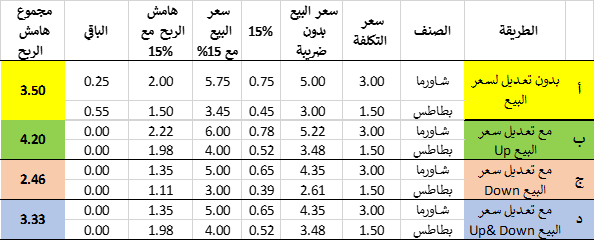 مثال توضيحي لمطعم وأخذنا فقط صنفين لتوضيح الأثر على هامش الربح وسعر البيع وإدارة النقد.