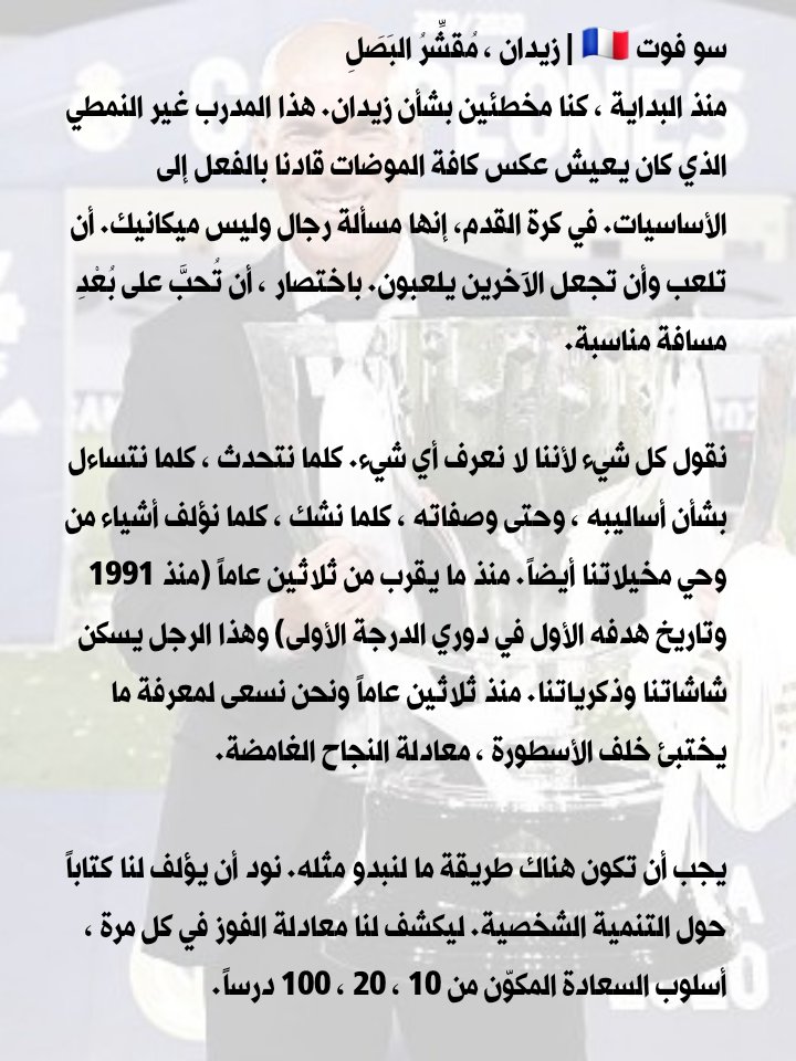 فلنتفق على أن فضل زيدان لا يكمن في فكرة ، بل في مسار. فزيدان لم يخلق تياراً ، لم يحلم أبداً بأن يكون عصرياً. لا ، زيدان ليس مدرباً ثورياً. إنه محافظٌ ، ولكن من الناحية الإيجابية للكلمة. منهجه هو العمل الشاق، الصرامة والتواضع.