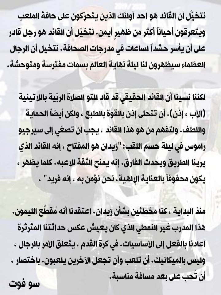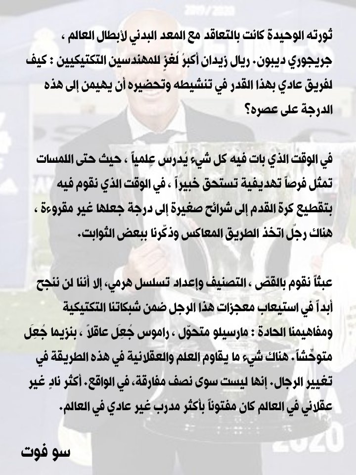 ريال زيدان أكبر لغز للمهندسين التكتيكيين: كيف لفريق عادي في تنشيطه وتحضيره أن يهيمن إلى هذه الدرجة على عصره؟ هناك شيء ما يقاوم العلم والعقلانية في هذه الطريقة في تغيير الرجال. إنها ليست سوى نصف مفارقة. أكثر ناد غير عقلاني في العالم مفتون بأكثر مدرب غير عادي في العالم.