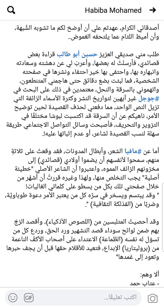 في هذا المنشور تتهم حبيبة أربعة شعراء دفعة واحدة بسرقتها!!