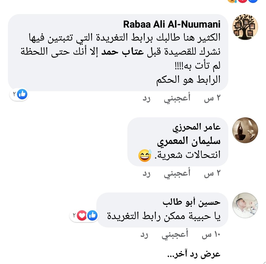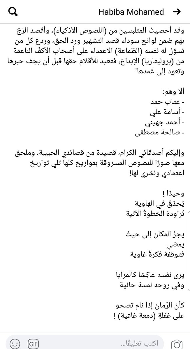من بين هؤلاءالذين اتهمتهم حبيبةالشاعرة العمانيةعتاب حمد، صاحبة القصيدةالمرفقة بالمنشور، والتي لم تكتف حبيبةبسرقتها، بل اتهمت عتاب بالسرقة! لكنها(أي حبيبة) عندما أرادت أن تثبت أن نصها منشور عام2017 أي قبل أشهر من نشره في حساب عتاب على تويتر، لم تستطع أن تأتي برابط قصيدتها المزعومة