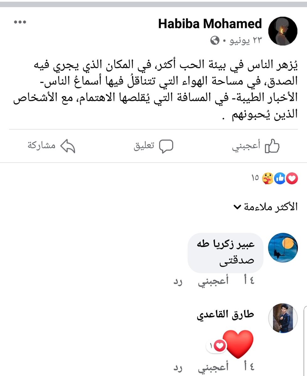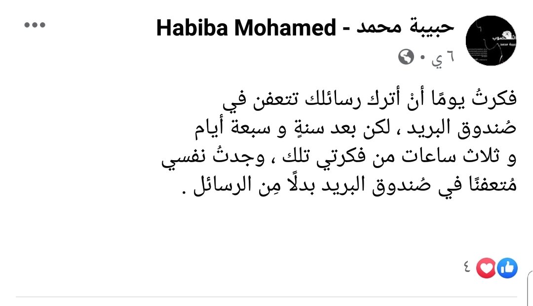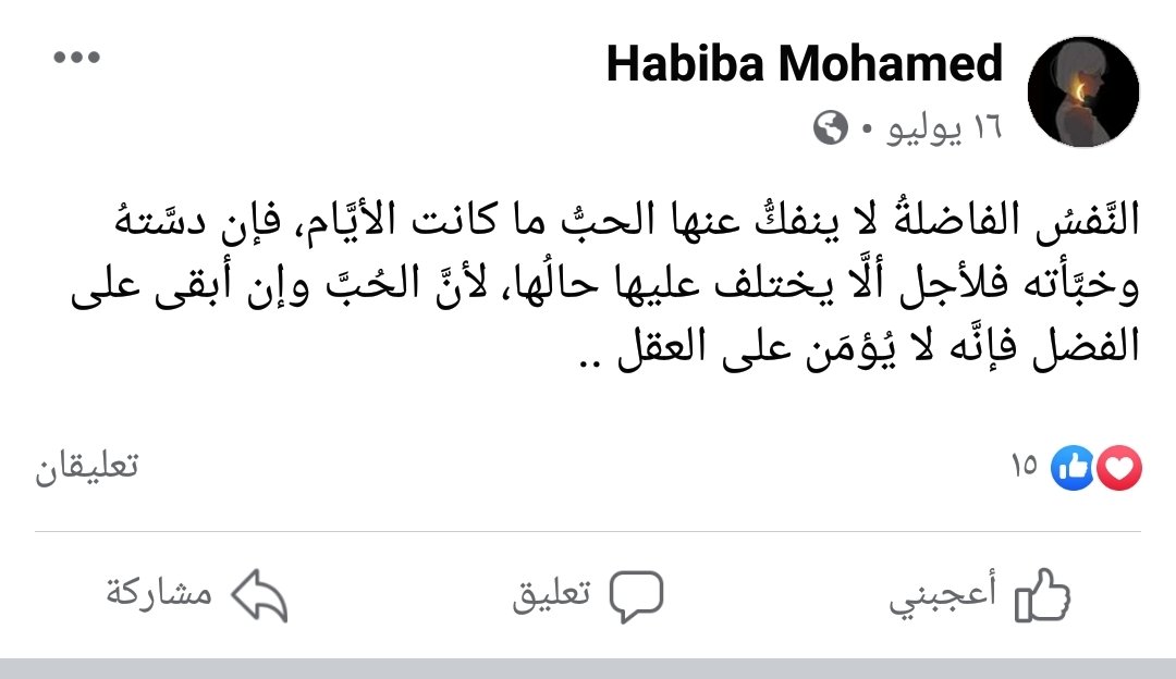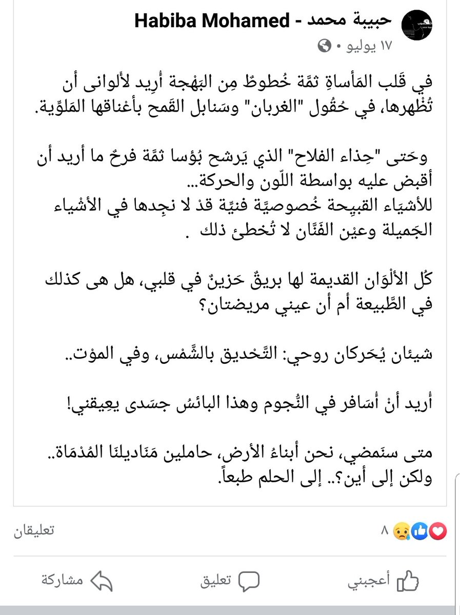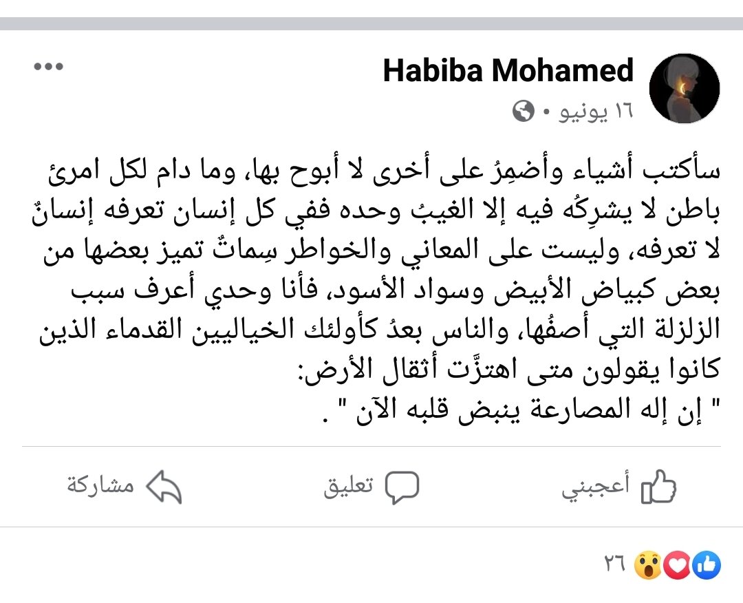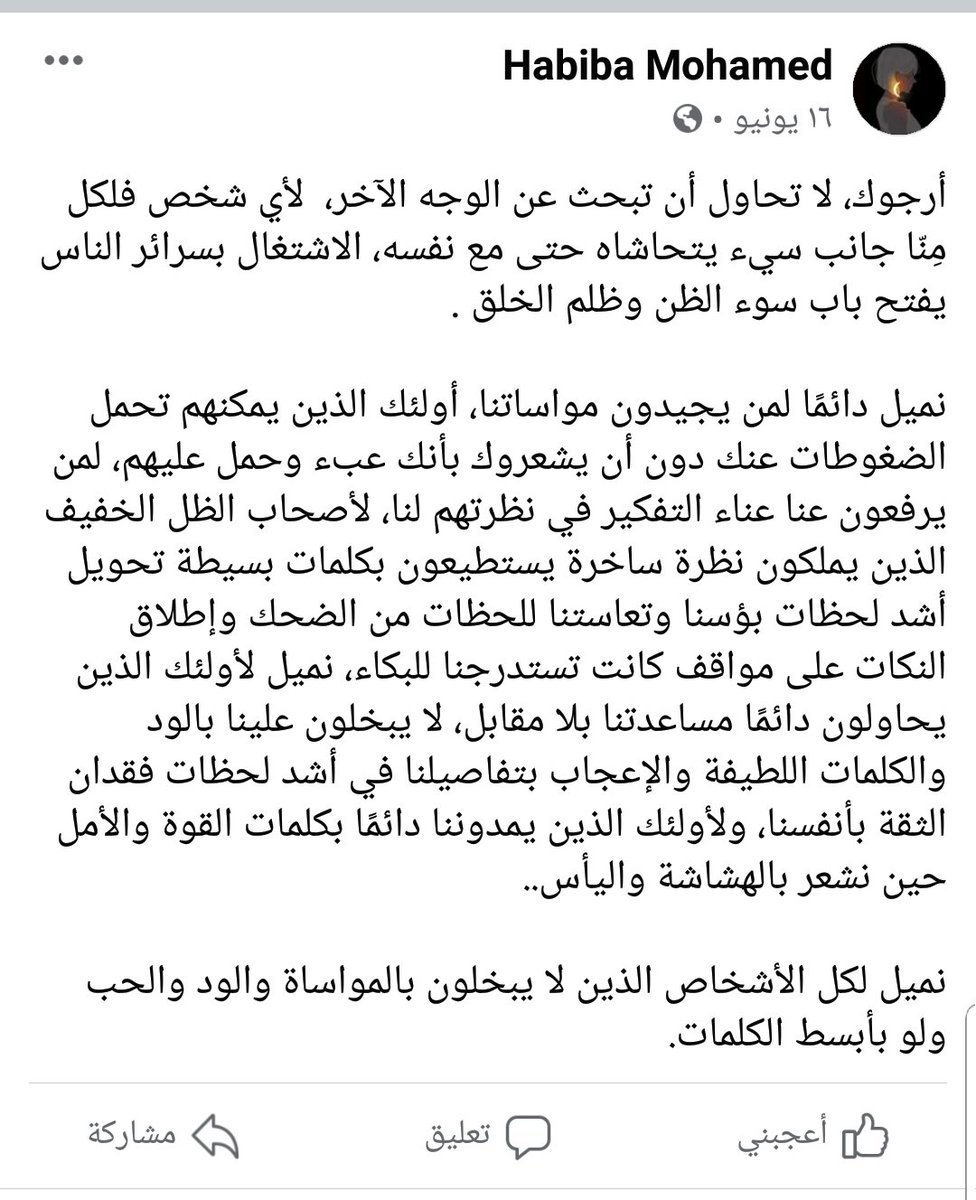 وهذا منشور فيسبوكي لها به فقرة أدبية جميلة منشور في 16 يوليو 2020: