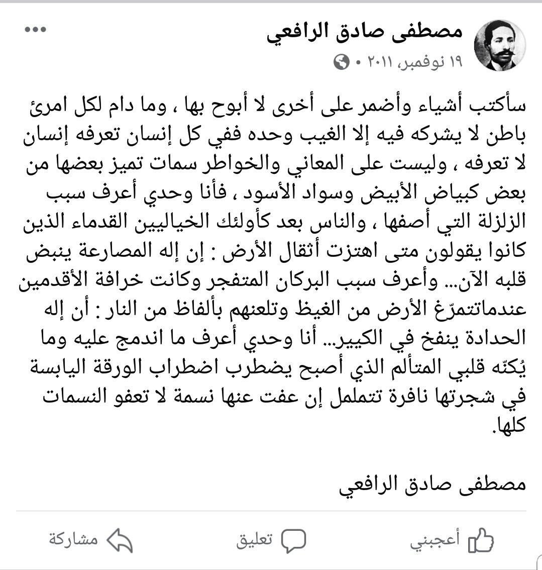 هذه الفقرة أعلاه هي للأديب مصطفى صادق الرافعي ونشرت في حساب الفيسبوك الذي يحمل اسمه في 19 نوفمبر 2011: