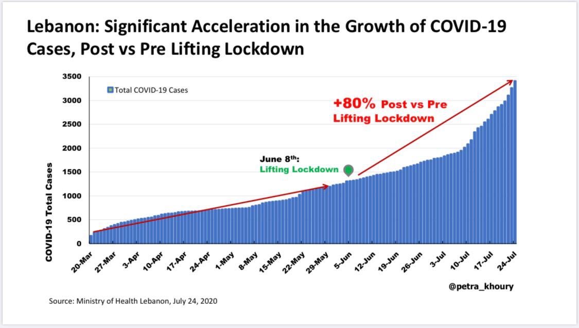 ٧.١ يقف لبنان امام خيار صعب. بالامس غردت @petra_khoury ، بصراحة ، الرسم البياني أدناه والذي يظهر التسارع الكبير في ازدياد عدد حالات #Covid19 ويتوقع تطورات "مروعة" ما لم نغير المسار. اذن بما أننا على شفا هاوية صحية أو اقتصادية ، أو كليهما ، ما هي الخيارات امامنا؟