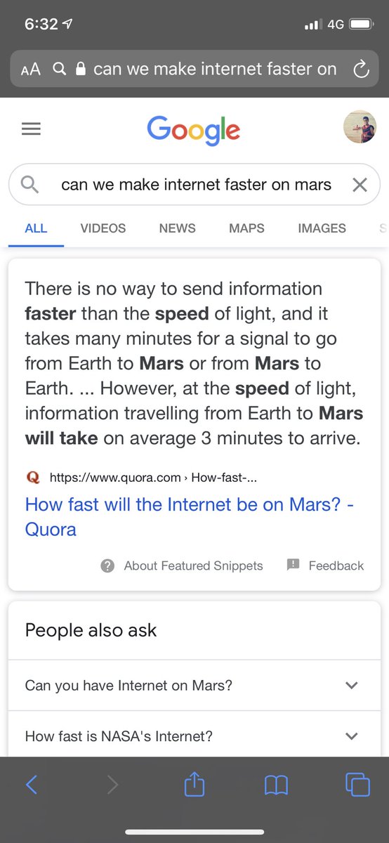اما بالنسبة لتصفح المواقع, أغلب الشركات ممكن انها تسوي سيرفرات في المريخ تنسخ المحتوى الموجود في الارض صح ان اصحاب المريخ راح يشوفون المحتوى متأخر عن الموجود في الارض لكن راح يمديهم يتصفحون المواقع ويكتبون النقاشات وممكن يتم ربط الانترنت بين الارض والمريخ