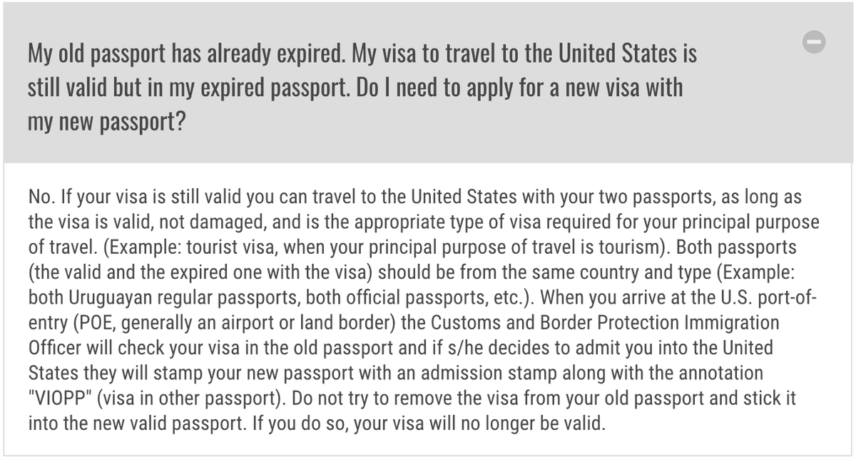- انتهت مدة جواز سفري السعودي ولكن تأشيرتي الأمريكية مازالت سارية .. هل يتطلب ذلك حصولي على تأشيرة جديدة ؟ الجواب لا، احتفظ بجواز سفرك القديم المرفق به تلك التأشيرة لتقديمه عند الطلب مع جوازك الجديد.