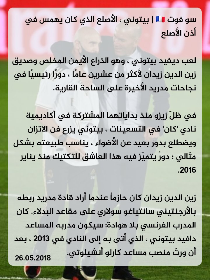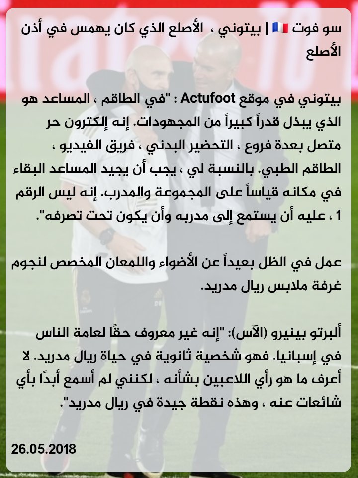 ألبيرتو بينيرو (آس): "بيتوني ضروري لزيدان. إنه من القلائل الذين يمكنهم الوصول إلى دائرته العائلية. فزيدان يثق به بشكل أعمى ، وهذا أمر نادر بالنسبة له".