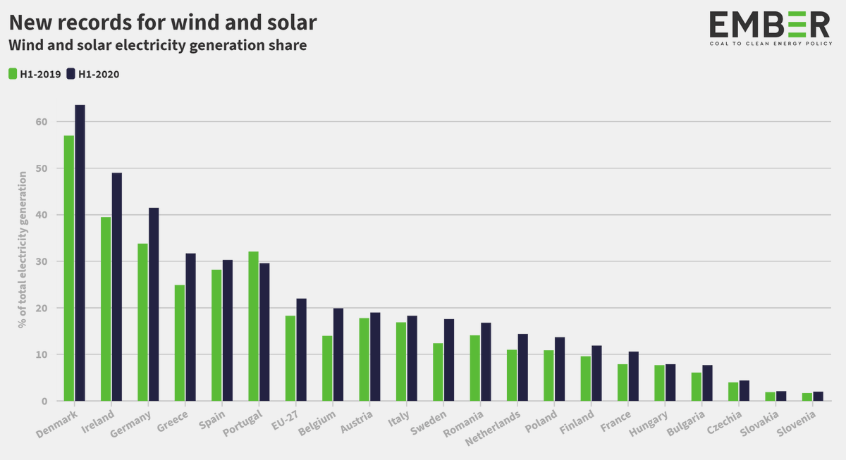 2 وصلت حصة التوليد بطاقة الرياح والطاقة الشمسية 21٪ من إجمالي توليد الكهرباء في أوروبا، وكانت أعلى نسبة توليد بالطاقة المتجددة في الدنمارك - 64٪ وإيرلندا - 49٪ وألمانيا -42٪.