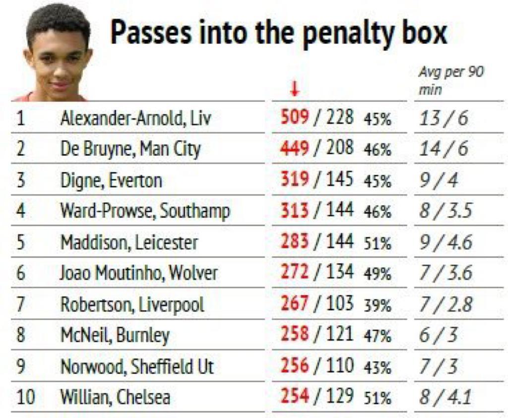 أرنولد أكثر اللاعبين تمريرا لداخل منطقة جزاء الخصم , قرابة نصف تمريراته تذهب لمنطقة الجزاء حيث مرر 228 كرة داخل المنطقة من أصل 509 بمعدل 45% وحل دي بروين ثانيا بـ 208 من أصل 449 تمريرة بنسبة 46% , كلا اللاعبين يمرران بمعدل 6 مرات للقاء الواحد