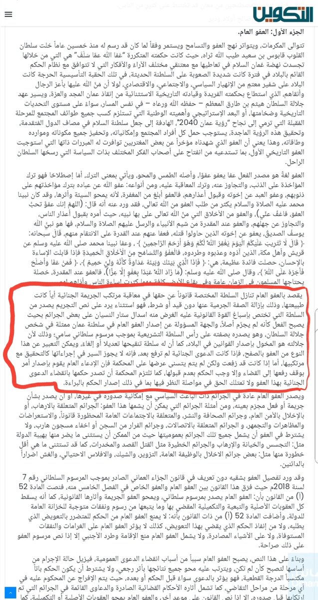 ونختم بالقول بما بدأنا به هذه السلسلة من أن عفو جلالة السلطان يستحق الإشادة والإطراء، بمقالات جيدة ومعبرة بصدق عن مشاعر كاتبيها، وليس بمقالات تلفيقية تنتهك حقوق الملكية الفكرية لكتاب آخرين. ولذا فقد وجب على الكاتب الاعتذار، وعلى مجلة "التكوين" @altakweenmgzn حذف المقال من موقعها.