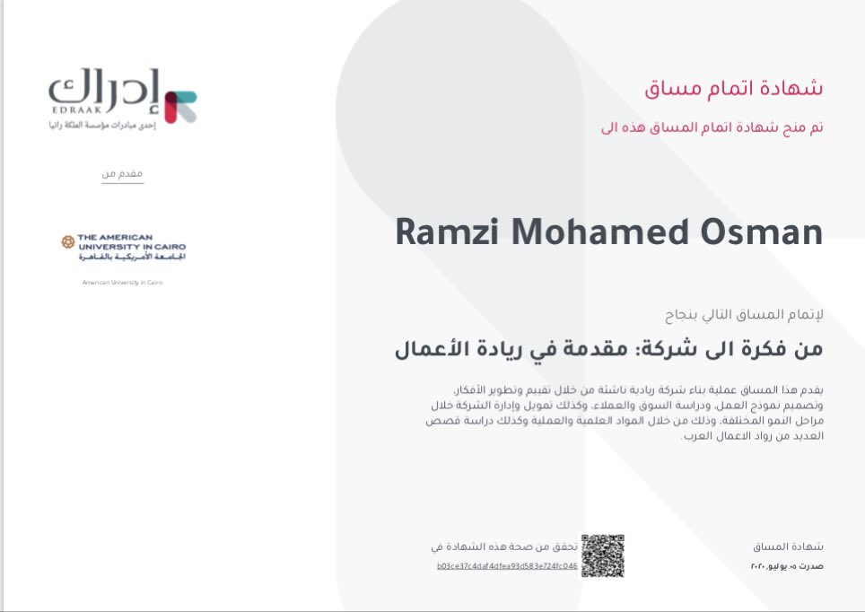 و برضو بما اني عارف انو شغلي والحاجة العايزه و بطمح ليها شنو و اني اكون صاحب شركتي الخاصه اخدته شهاده من الجامعة الامريكية في مصر في "مقدمه في ريادة الاعمال" عارف لسه بدري بس المهم هي بداية 😅❤️