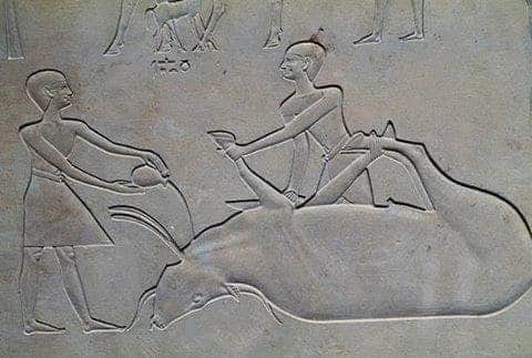 4-وكان قدماء المصريين يتعاملون مع الحيوان عند ذبحه بكل رحمة ولين فكانوا لايعنفونه قبل أن يوقع على الأرض اعتقاداً منهم