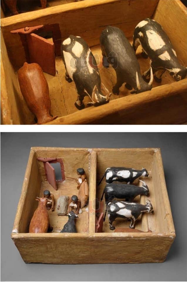 7-وجدت البعثة في المقبرة مجموعة كبيرة من النماذج-الماكيتات-للخدم وأصحاب الحرف والصناعات وحقول وبيوت وأسواق ومذابح وكانت من أبرز النماذج التي وجدت هي مجسم لقاعة الذبح مكونة من عدة غرف في غرفة منهم يقف الجزارون يتجهزون لذبح العجول المربوطة أرجلها وبجانبهم يقف المشرف على عملية الذبح
