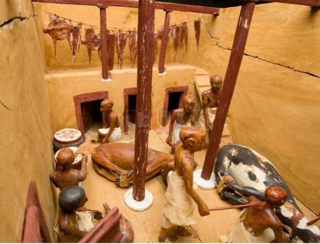 8-كما يوجد في الغرفة كاتب يقوم بالحساب، وطهاة يقومون بتحضير الطعام، فضلًا عن وجود بعض اللحوم المعلقة في طابق ثاني للتجفيف.