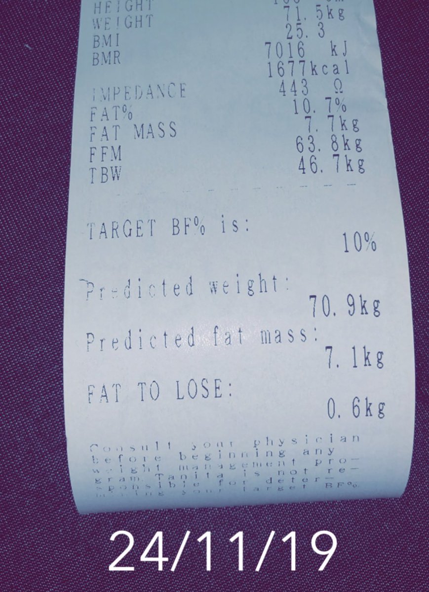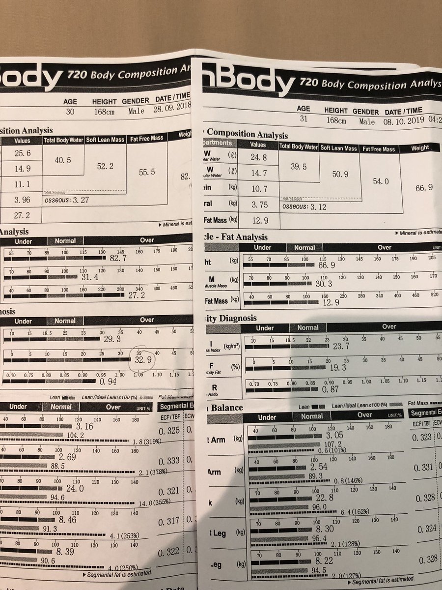 طبعاً هنا اقتنعت ان الرقم غير مهم، لاني كنت امارس تمارين مقاومة، فوزني نزل ٢.٩ كج لكن وزن الدهون ٣.٥ كج وارتفع العضل والسوائل ٠.٦ كج