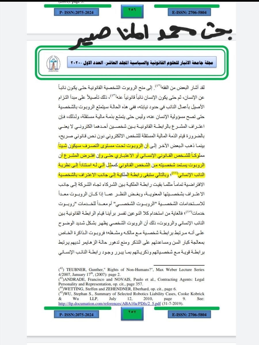 ولكنِّي تفاجأتُ بنشر الباحث محمد المناصير في العدد 1 المجلد 6 من مجلة العربية للعلوم ونشر الأبحاث لبحث تحت عنوان: "إشكالية الشخصية الالكترونية القانونية للروبوت - دراسة تأصيلية تحليلية مقارنة في إطار التشريعين المدني العماني والأوروبي" في 30 مارس 2020: