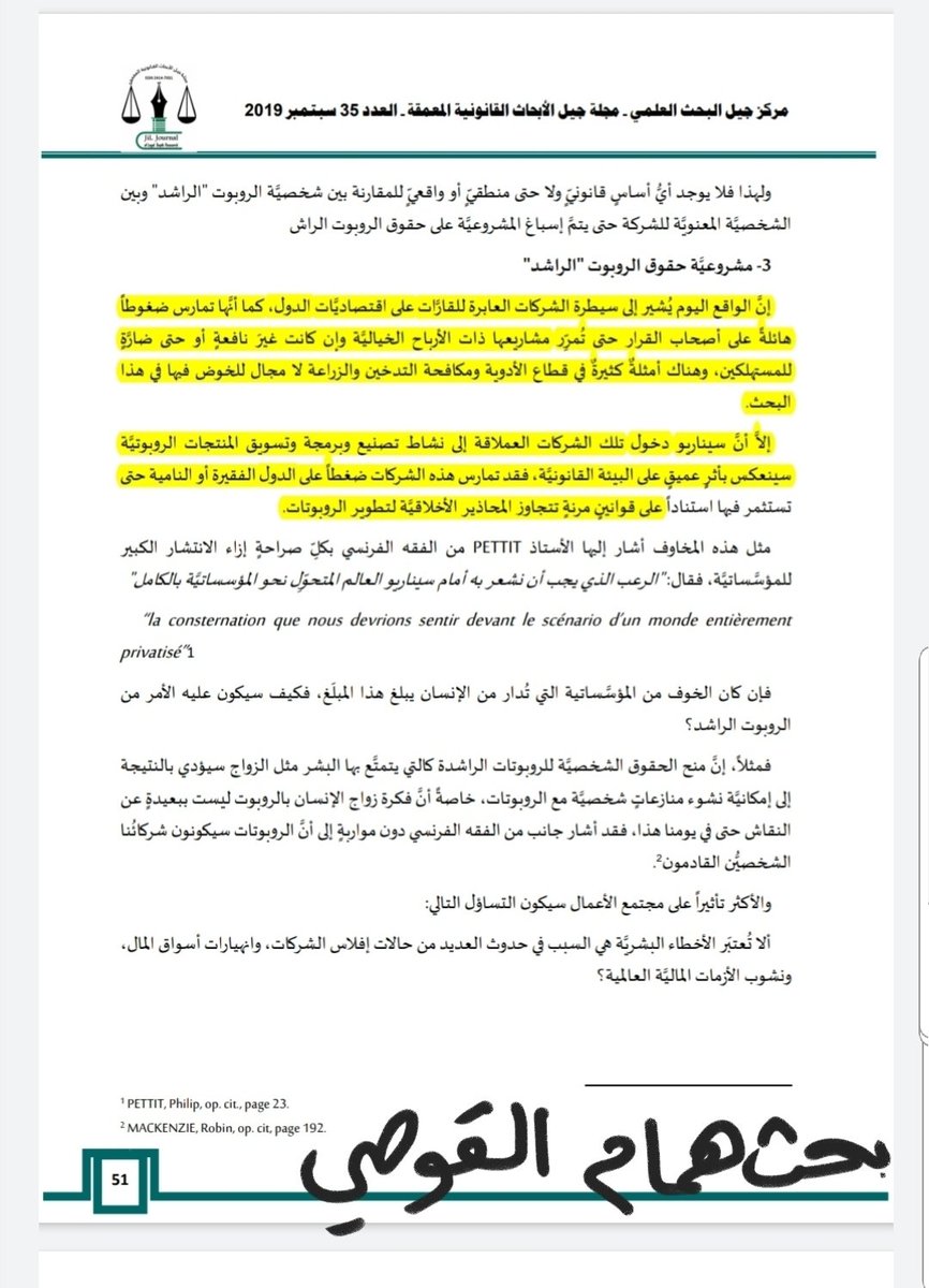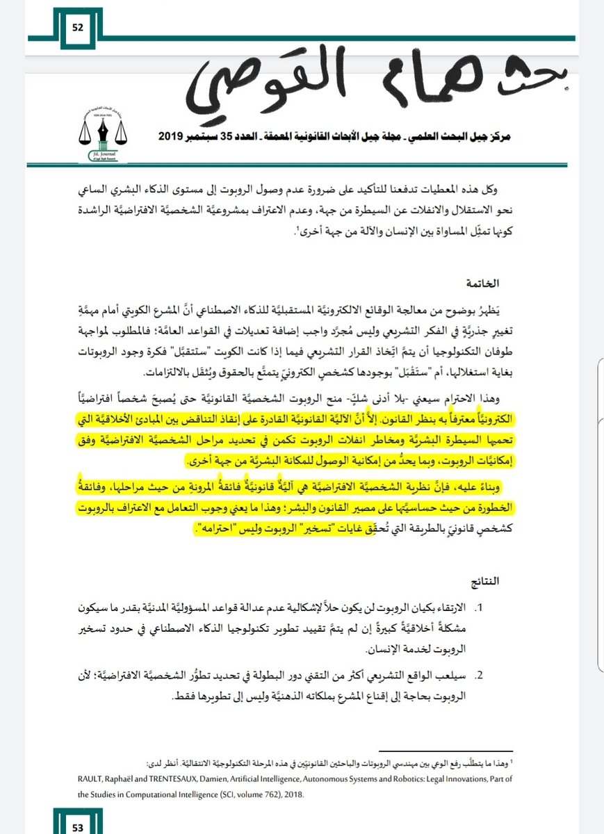 تشرفتُ بنشر بحثي: "نظرية الشخصيَّة الافتراضية للروبوت وفق المنهج الإنساني -دراسة تأصيلية تحليلية استشرافية في القانون المدني الكويتي والأوروبي-" في مجلة جيل الأبحاث القانونية المعمقة الصادرة عن مركز جيل البحث العلمي،لبنان، العدد35، سبتمبر 2019. رابط النشر: