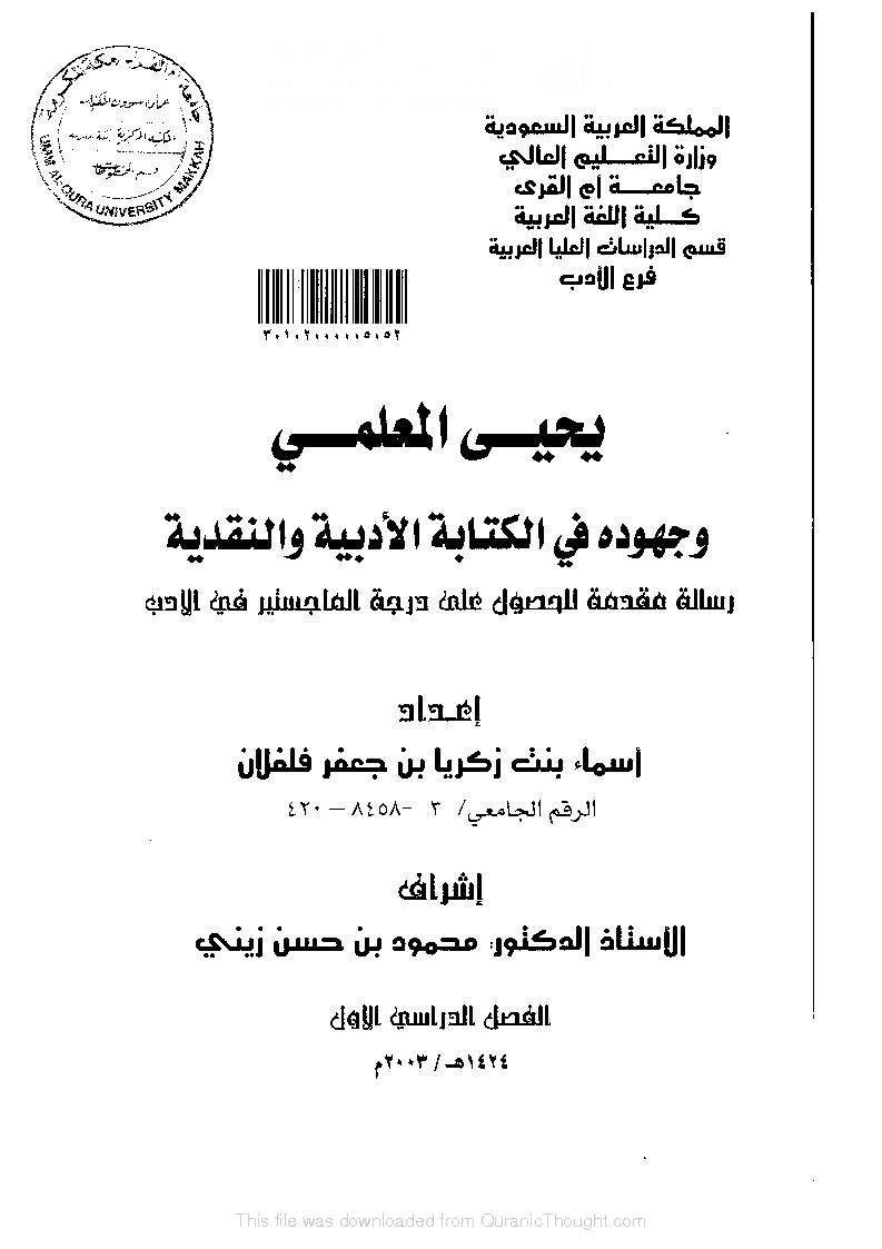 يعد الفريق يحيى المعلمي (ت١٤٢١هـ/٢٠٠٠م) رحمه الله أحد حماة اللغة العربية، وله شعر، ومقالات نقدية وأدبية، ومن هنا وجدت الباحثة أسماء فلفلان هذه الشخصية مجالاً لأطروحة جامعية، فأنجزتها في عام ١٤٢٤هـ/٢٠٠٣م في جامعة أم القرى.