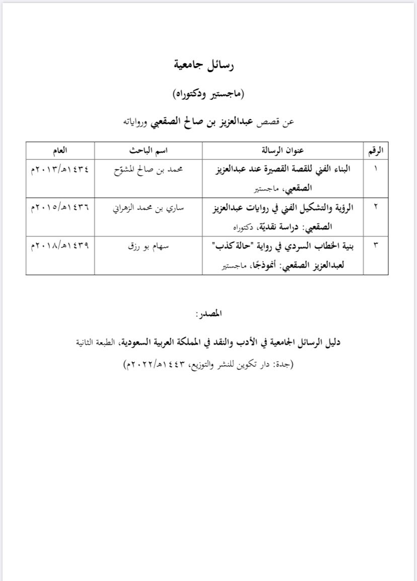 تناولت ثلاث رسائل جامعية أدب عبدالعزيز بن صالح الصقعبي@abdulazisaleh، وهي: البناء الفني للقصة القصيرة عند عبدالعزيز الصقعبي (ماجستير)، والرؤية والتشكيل في رواياته (دكتوراه)، وبنية الخطاب السردي في روايته "حالة كذب"(ماجستير).