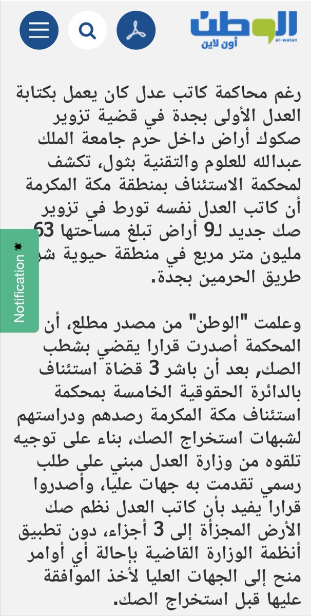 5- وكانت اول قضية فساد اراضي وجه الملك(قبل كارثة سيول جدة2009م)بنشرها التحقيق فيها ومحاكمة المتورطين(14) تزوير صك أرض جامعة الملك عبدالله #كاوست في ثول