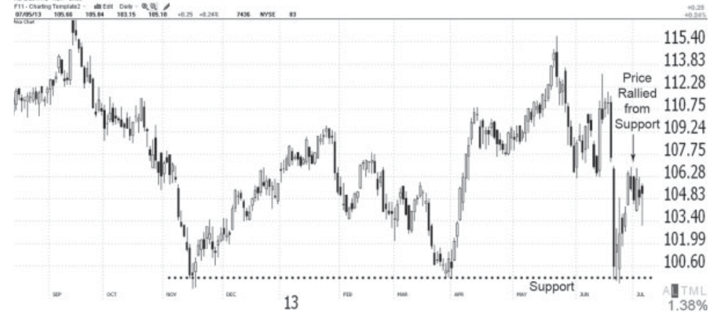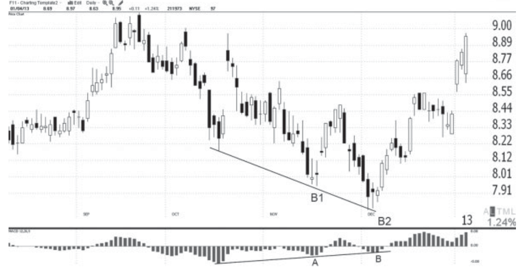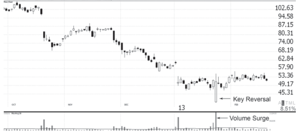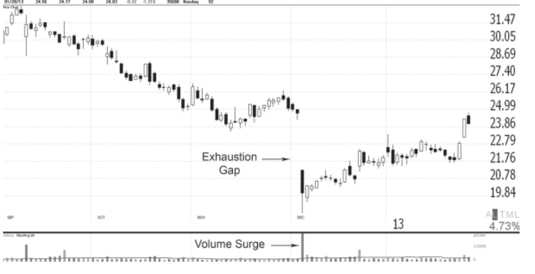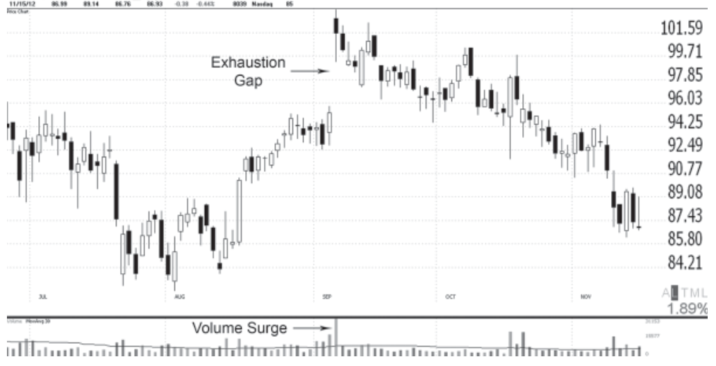 ثاني العلامات وهو امتداد لما سبق يعرف بـ Exhaustion Gap ويحدث عندما يكون السهم في ترند وتكون هناك قفزات وعمليات شراء ومن ثم قاب اب تاركا فجوه بالشارت وسرعان ما يبدأ السهم بالهبوط ليغلق الفجوة. من خصائص هذا النوع انه يكون الافتتاح من غير دعم يسنده خاصه اذا اغلق تحت هذا الدعم -يتبع