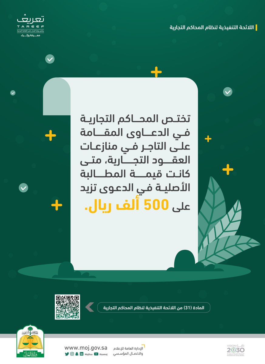 تختص المحاكم التجارية في الدعاوى المقامة على التاجر في منازعات العقود التجارية، متى كانت قيمة المطالبة الأصلية في الدعوى تزيد على خمسمائة ألف ريال.