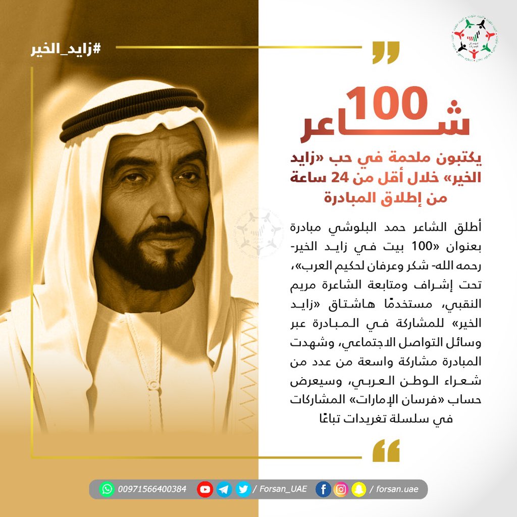 خلال أقل من 24 ساعة.. 100 شاعر من مختلف الدول العربية يشاركون في مبادرة "100 بيت في #زايد_الخير - رحمة الله عليه- شكر وعرفان لحكيم العرب"، والتي أطلقها الشاعر حمد البلوشي وتحت إشراف الشاعرة مريم النقبي