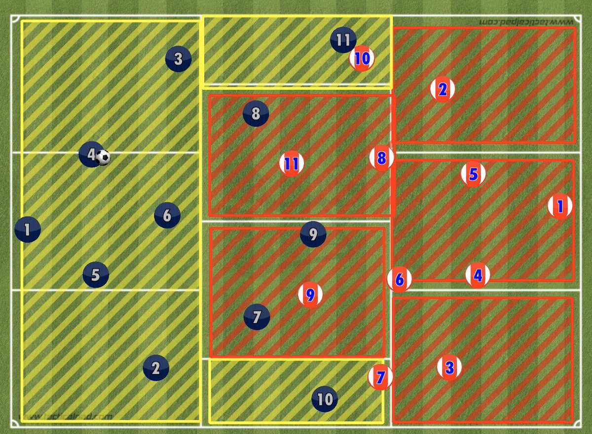 - سيميوني ينتقي إسلوبه حسب الخصم ، ولكن دائماً بـ 4-4-2 ، كيف ؟ يدرس المساحات التي يُفضل خصمه اللعب فيها ، ويقوم بـ "زرع" لاعبيه بتلك المناطق ليسيطر عليها ويمنع الخصم من اللعب بطريقته المفضلة ، تماماً كما فعل امام كلوب بالصورة. 🟥 مناطق حجبها سيميوني