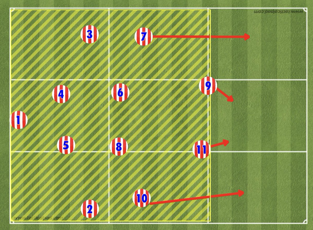 - يُفضل سيميوني دائماً السيطرة على أكبر قدر ممكن من مربعات الملعب ، ليُغطي أكبر مساحة ممكنة وترك الخصم يلعب في مناطق ضيقة جداً ، لذلك يُعد سيميوني مدرب دفاعي بحت.