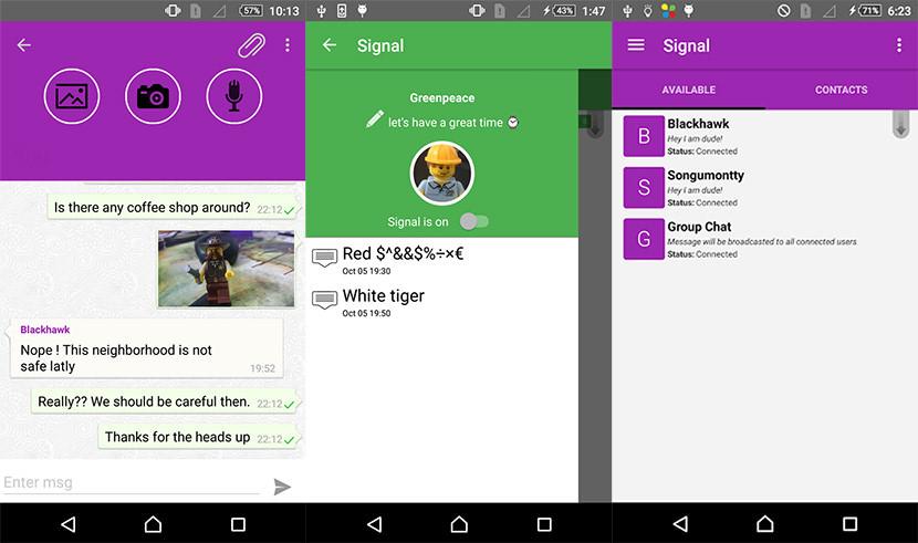 هو تطبيق المراسلة دون اتصال القائم على Wifi Direct. تسمح لك Signal بالتواصل بدون إنترنت أو شبكة محلية في نطاق يصل إلى 100 متر. يمكن أن تكون المراسلة فردية أو في مجموعة. يتم تسليم الرسائل المرسلة عبر تطبيق الإشارة بطريقة آمنة.