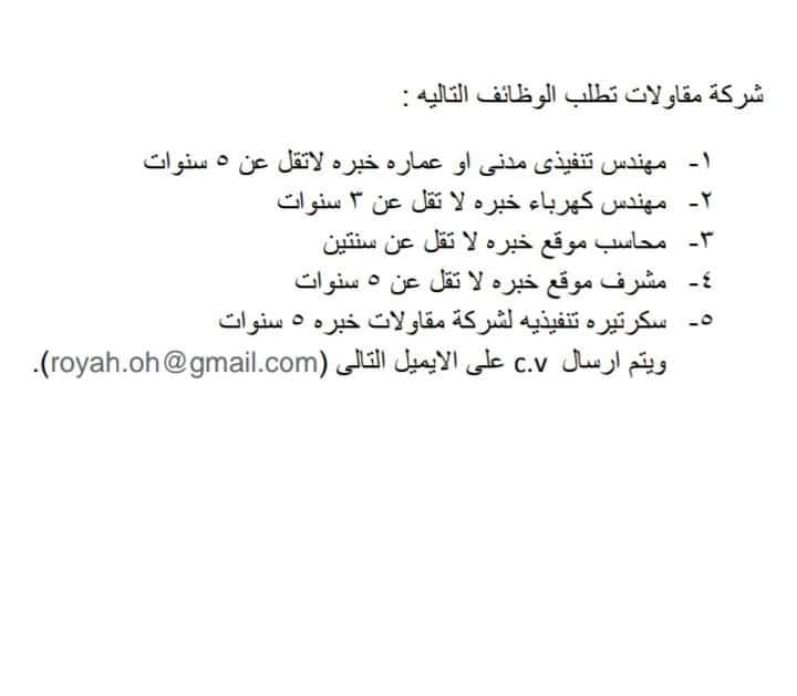 مطلوب مهندس كهرباء ومهندس ميكانيكا تنفيذي خبرة من 4 الى 8 سنوات مقيم بالسعودية.. نقل كفالة فقط يرسل ال CV على الايميل Mohamadyounis2013@gmail.com
