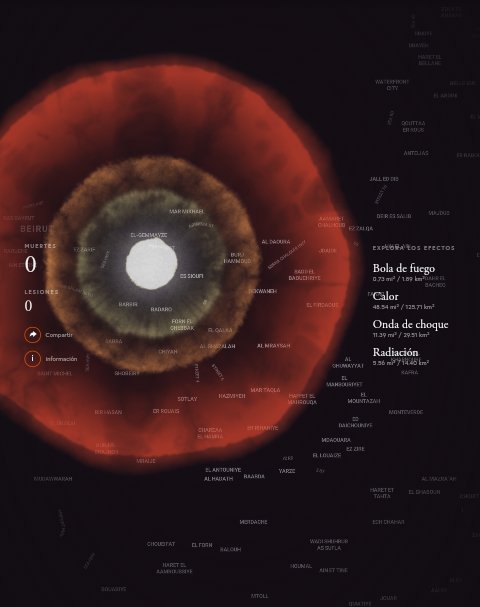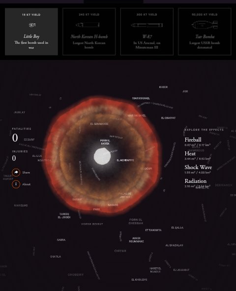 قمت بمقارنة إنفجار قنبلة نووية في #بيروت بقوة ١٥ كيلو طن ( نفس قوة تفجير قنبلة الولد الصغير التي ضربت #هيروشيما ) عبر موقع #Outrider الذي يتيح خدمة إلكترونية لحساب حجم المساحة التي يغطيها الإنفجار النووي (تضع المدينة في خانة البحث وتختار نوع القنبلة من الاعلى)