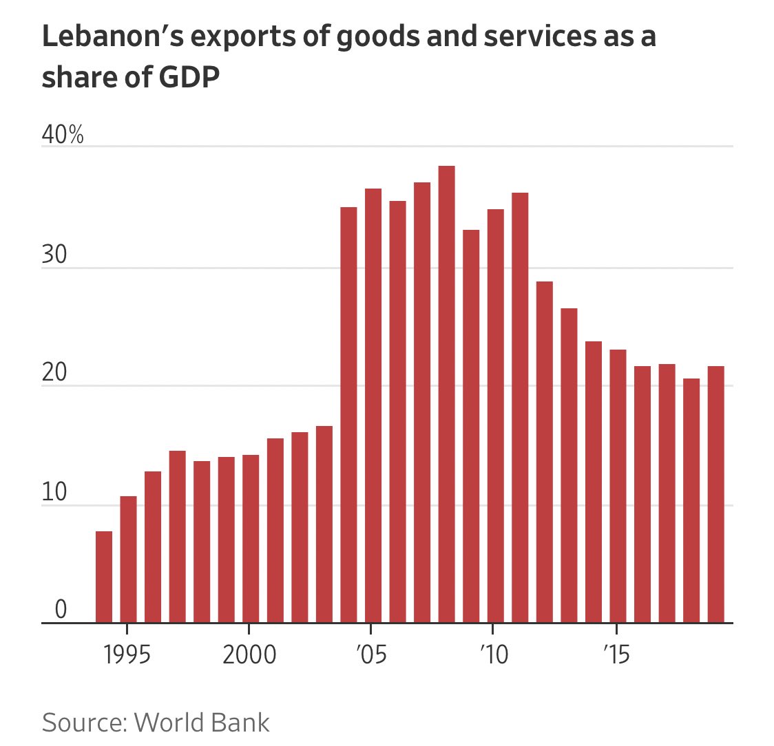 كما ان الاقتصادات الخدمية والتي اتخذت منها لبنان نموذجاً تكون في امس الحاجة للاستقرار السياسي خصوصاً ان معظم موارد لبنان استخدمت في بناء المطارات ، الطرق ، الفنادق ونظام بنكي مغري للاستثمار الاجنبي. وذلك بغرض جلب العملة الصعبة والسياح وقضاء المغتربين اجازاتهم وايداع اموالهم بها