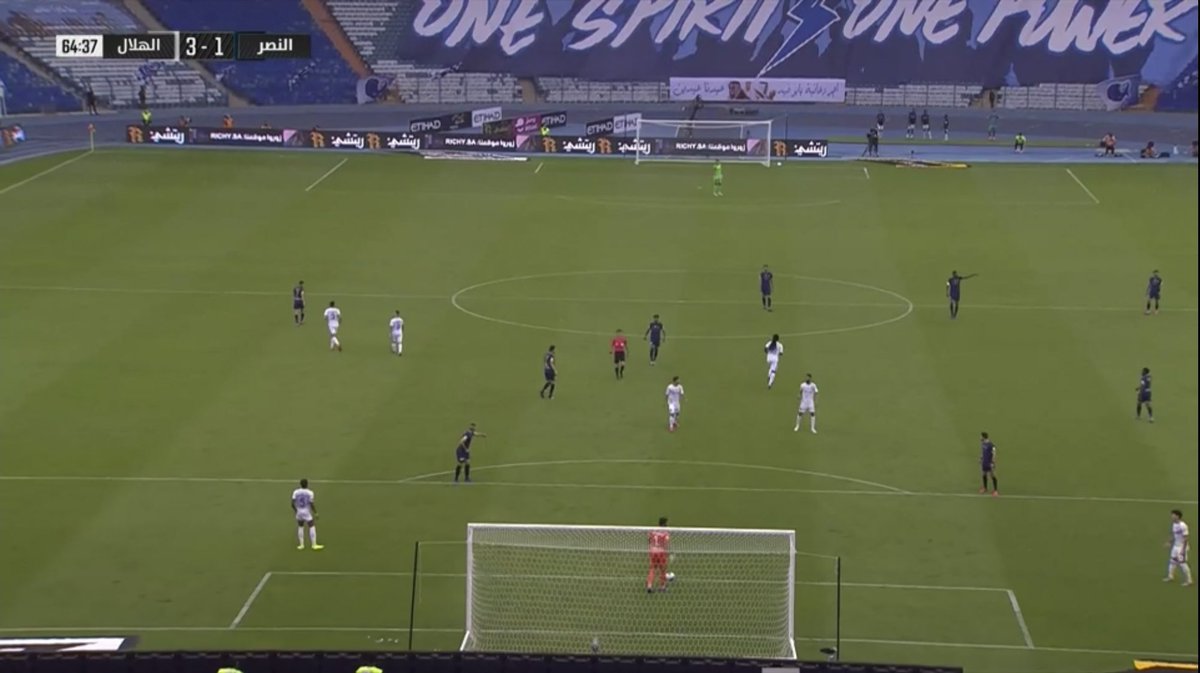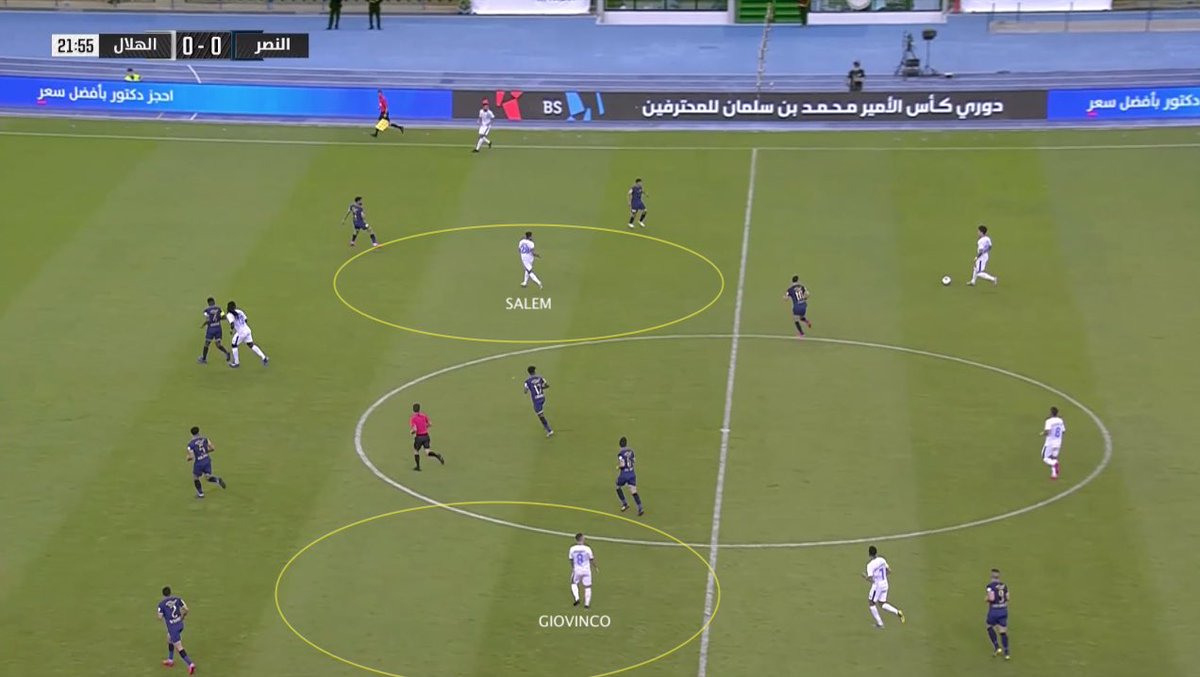 فكرة فيتوريا في ظني هي ان الهلال أقل حالاته خطورة هي لما تكون الكرة مع مدافعيه قياساً بوجودها مع لاعبي وسطه او مهاجميه ، وبالتالي اخذ فيتوريا قرار انه يعطي دفاع الهلال حرية التقدم بالكرة ويأخّر منطقة الافتكاك ورى خط المنتصف ومن ثم يضرب الهلال بالمرتدات عبر اي كرة ينجح في افتكاكها