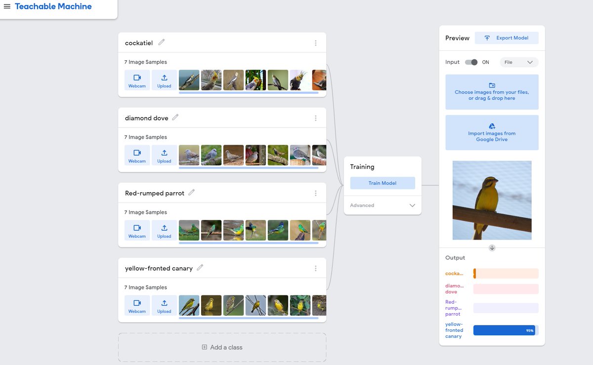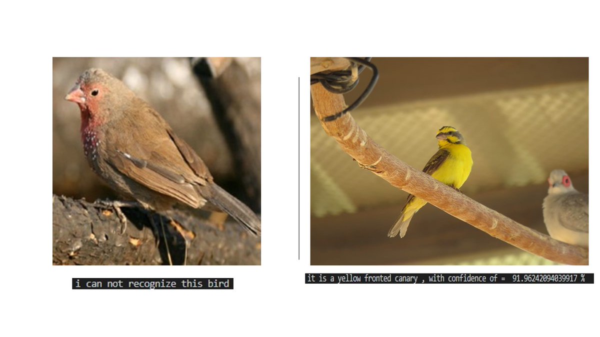 ملاحظة : وحده من الصور كان المفروض يتعرف على الطير لكن اعتقد السبب ان صور الطير هذا الي استخدمتها ك data كان لون الطير اخضر باغلبها وبالصور الي جربتها كان اصفر لونه، فمهم جدا تكون البيانات اكبر من الي اعطيته بس هي كانت تجربه