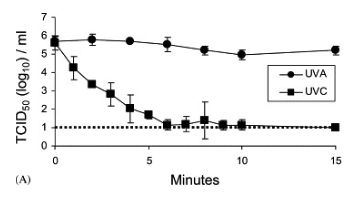 أظهر أن التعرض لـ UV-C بشدة "4" mW/cm2 ومن على مسافة "3" cm أدى إلى انخفاض شديد في كمية الفيروس بعد 6 دقائق، وتم تعقيم السطح بشكل تام بعد 15 دقيقة.