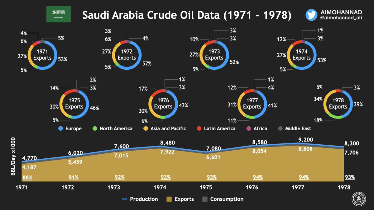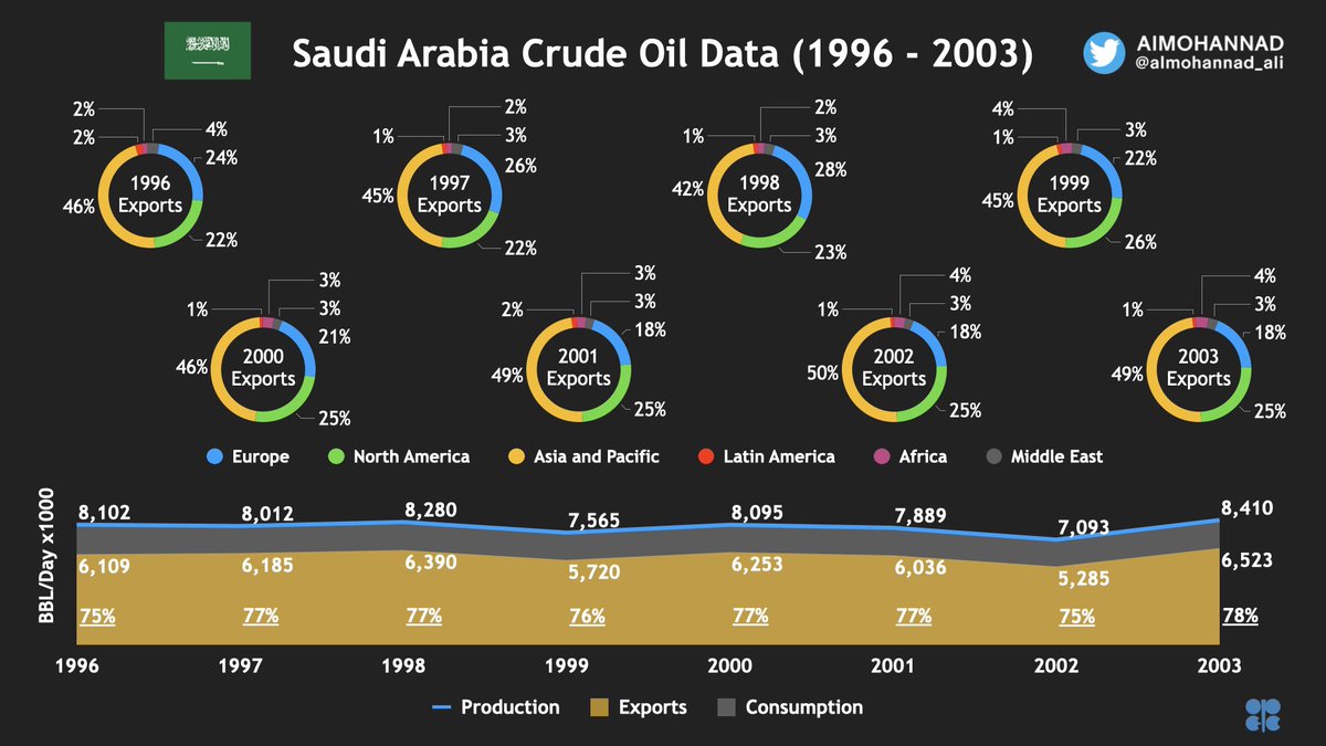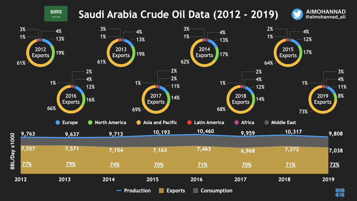 بدأت نسبة الصادرات #السعودية من #النفط لاوروبا 🔵 بالانخفاض و نسبة الصادرات النفطية لآسيا بالارتفاع.