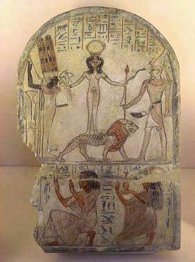 3-لإن لأول مرة في عهد الأسرات نجد إن المصري القديم يقدم قرابين ويستنجد بآلهة غير مصرية فنشوف فيها "كودوشو"وهي تقف عارية علي ظهر أسد (الحيوان المقدس في آسيا)بين اثنين من الآلهة الذكورية "ريشب" و "آمون رع" وفي الأسفل رعموزا وزوجته وهم يقدمون القرابين 👌👇