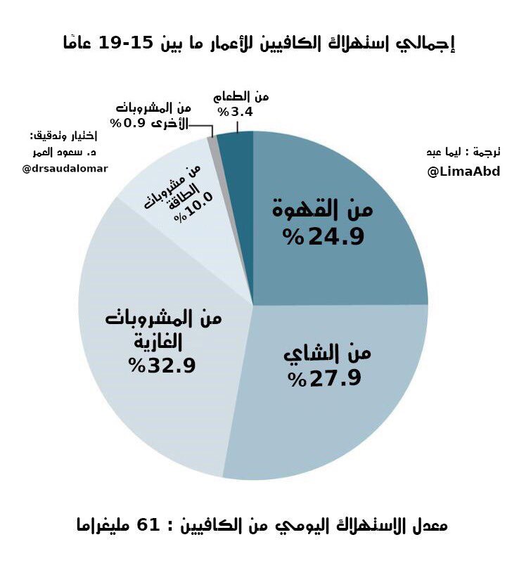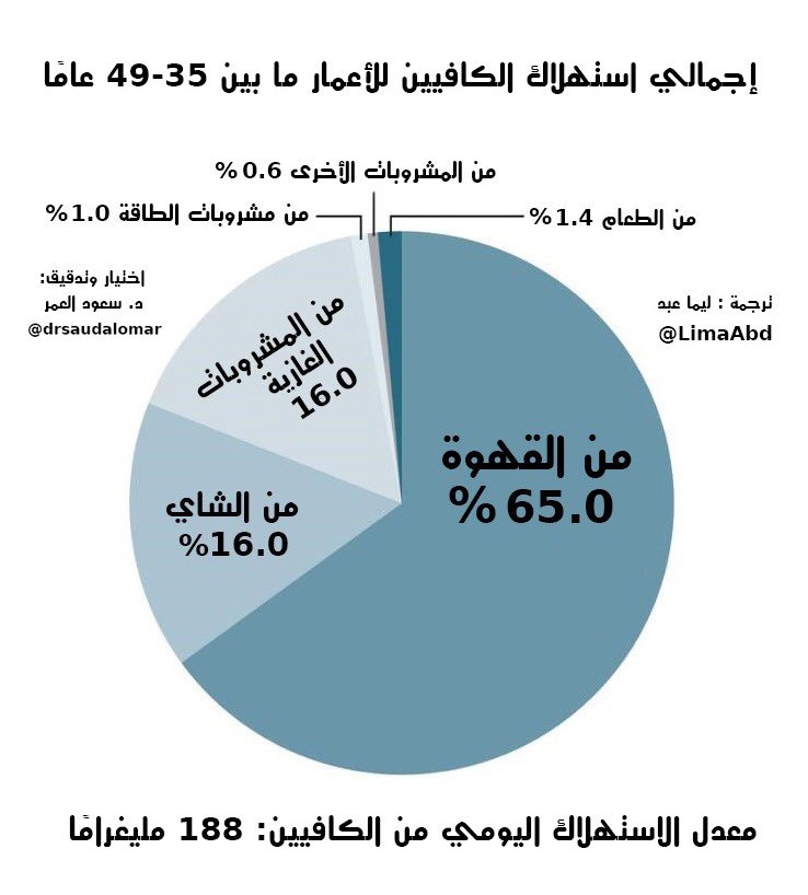 يستهلك ٨٥٪ من الامريكان الكافيين ويستهلك الشخص الواحد ١٣٥ ملغ يوميا (٣٥٠ مل قهوه)
