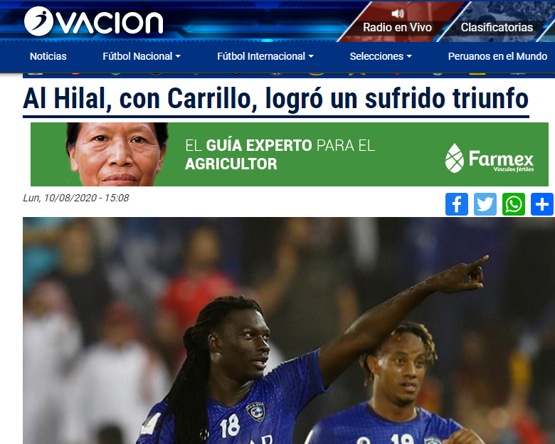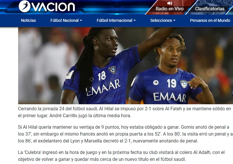 💥 صحيفة "ovacion" البيروفية: #الهلال حقق فوزًا صعبًا على ضيفه الفتح بنتيجة 2 ـ 1. المهاجم بافتيمبي جوميز كان بطل اللقاء، وسجل كافة الأهداف في الخصم وفي مرمى فريقه. أندريه كاريلو شارك خلال آخر 30 دقيقة من المباراة. تحقيق الفوز كان مطلب من أجل الحفاظ على فارق التسع نقاط مع النصر.