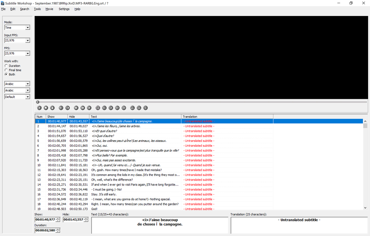 1- من خلال سلسلة التغريدات هذي راح أشرح أساسيات الترجمة بشكل عام. المجال مفتوح لاختيار أي برنامج للترجمة بما أنها متشابهة تقريباً، لكن الشرح بيكون على Subtitle Workshop (نسخة 2.51) لأنه بسيط وواجهته سهلة الاستخدام.