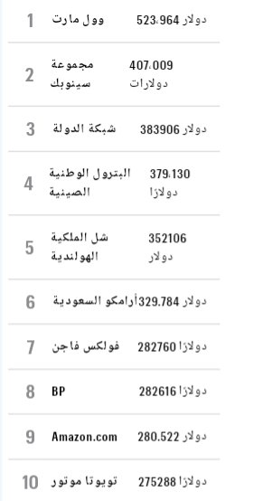 عن قائمة #Global_500 لترتيب الشركات العالمية لعام ٢٠٢٠م حيث أصدرت مجلة #فورتشن تصنيف أقوى ٥٠٠ شركة عالمية لعام ٢٠٢٠م وقد حققت شركة #ارامكو #السعودية المركز السادس في قائمة جلوبال 500 من حيث الإيرادات حيث كانت إيراداتها عام ٢٠١٩م قرابة ٣٣٠ مليار دولار
