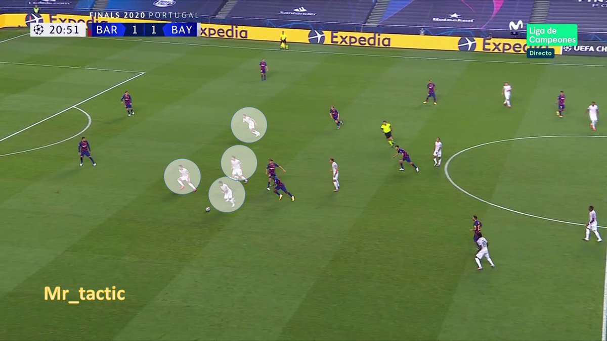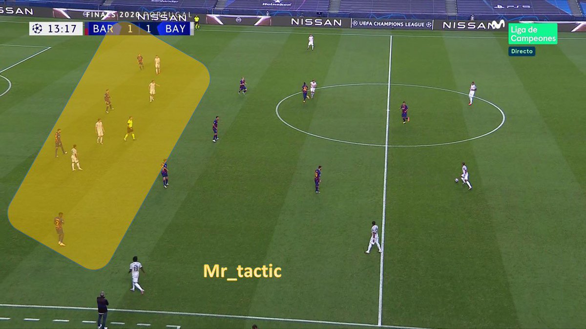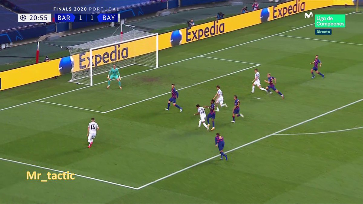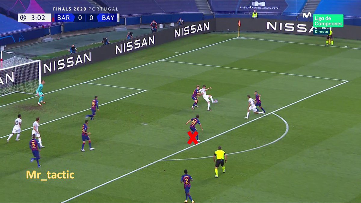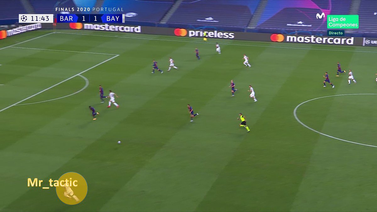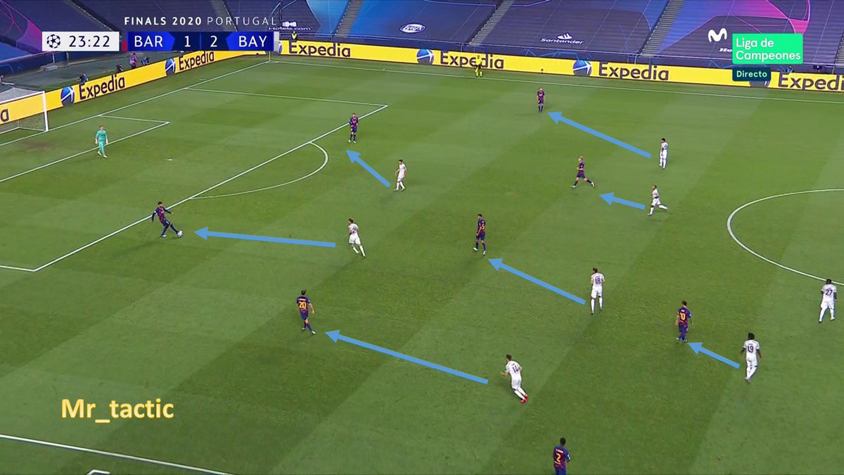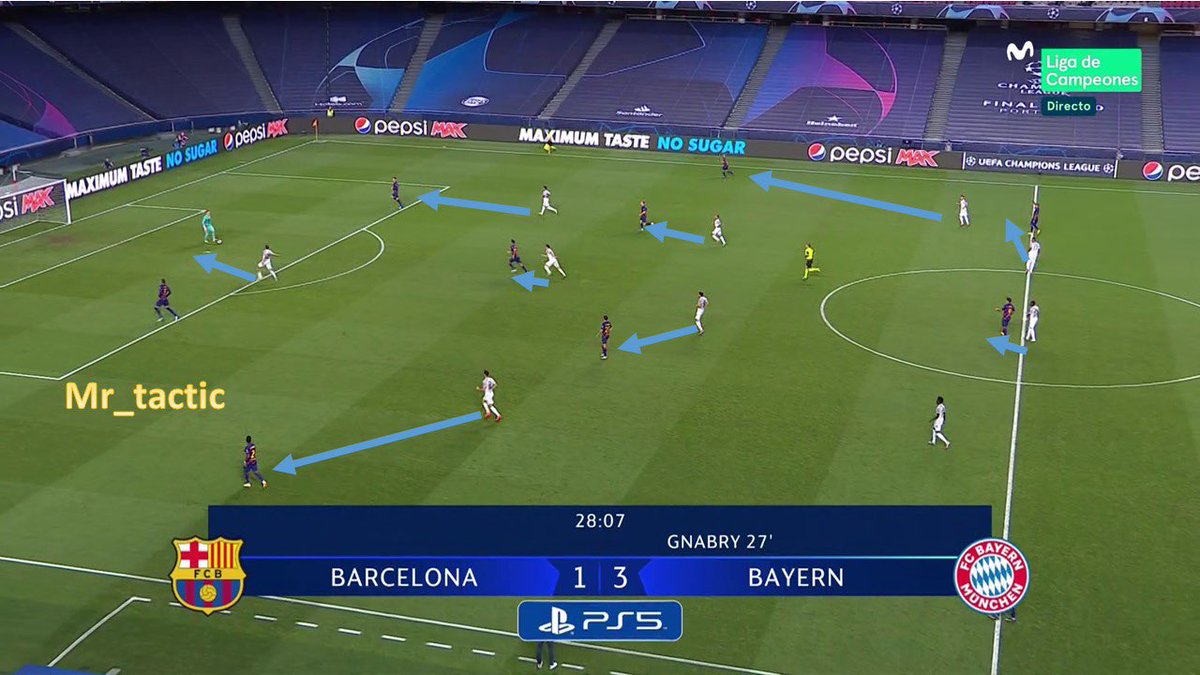 وبذلك لاحظنا بداية المباراة برشلونة يلعبون بضغط عالي وست لاعبين في مناطق بايرن ميونخ لمنع البناء من الخلق#ف وتقليل المساحات أمام لاعبي بايرن ميونخ