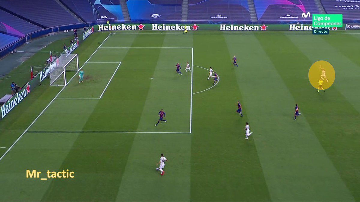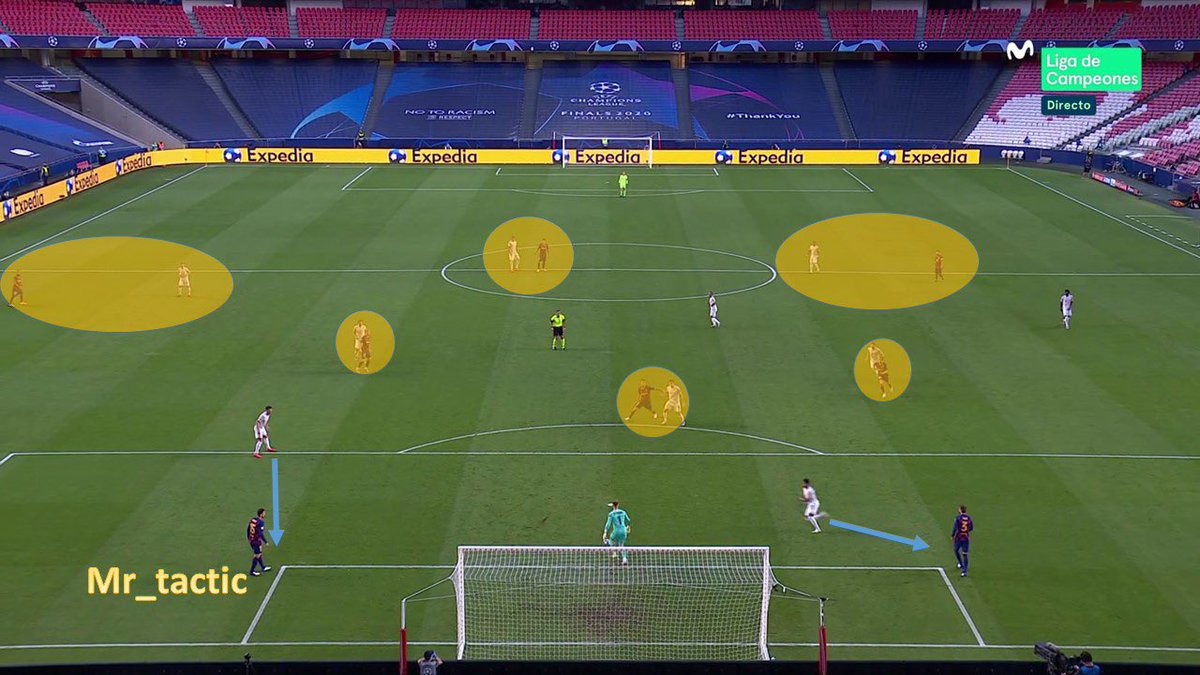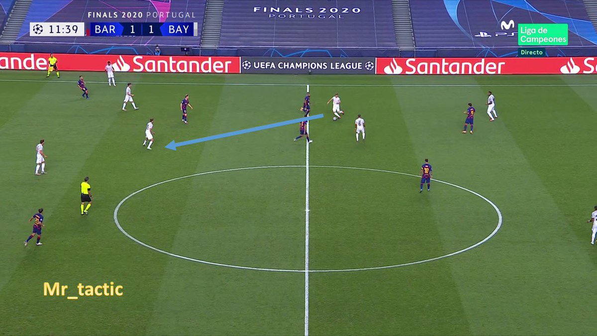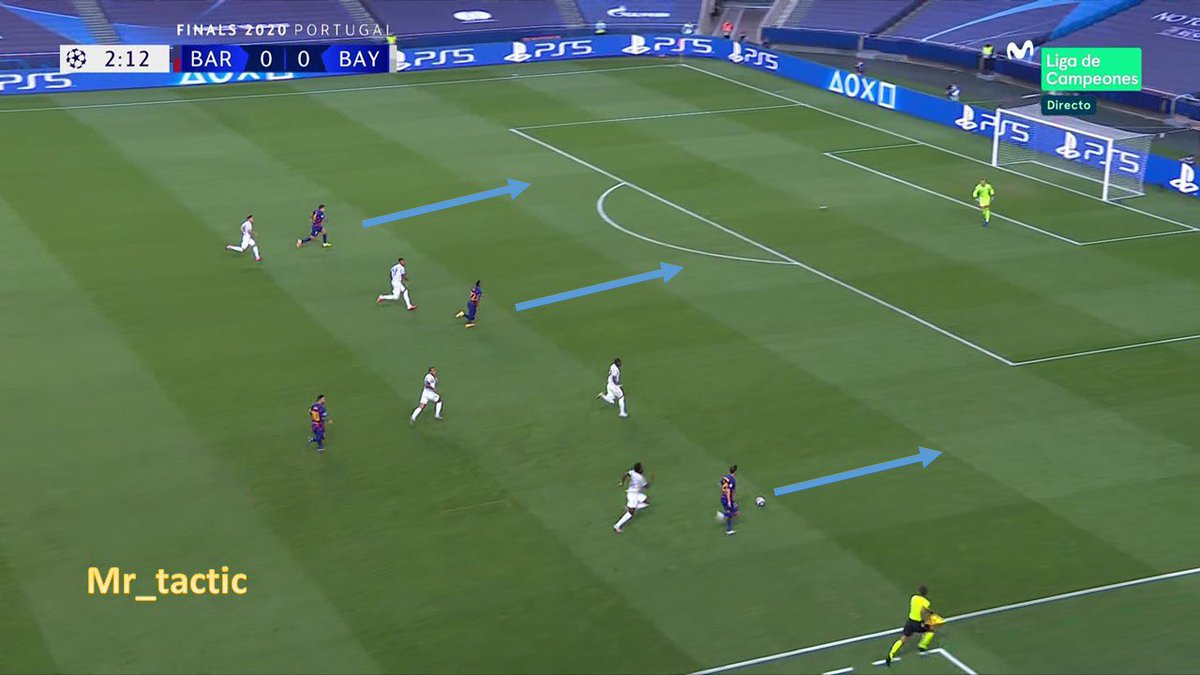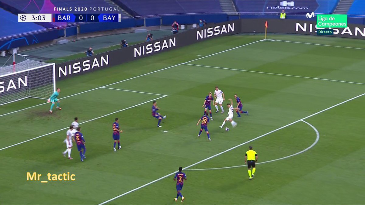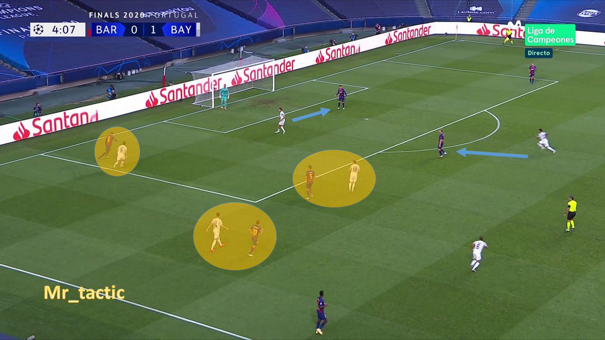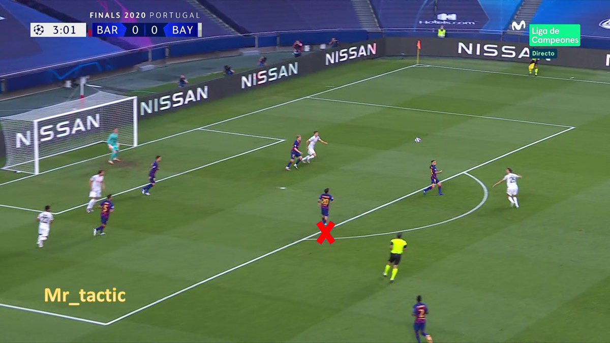 وبذلك لاحظنا بداية المباراة برشلونة يلعبون بضغط عالي وست لاعبين في مناطق بايرن ميونخ لمنع البناء من الخلق#ف وتقليل المساحات أمام لاعبي بايرن ميونخ