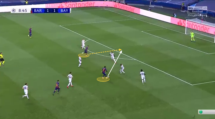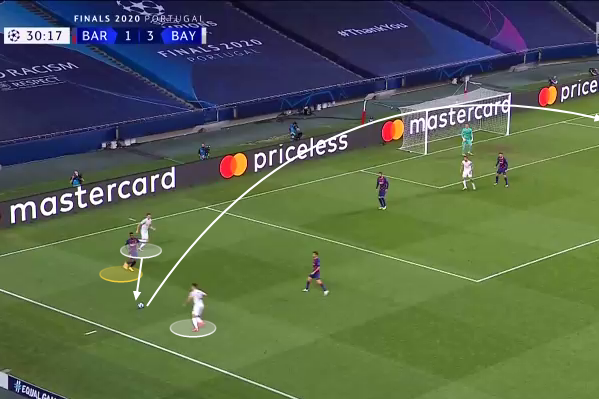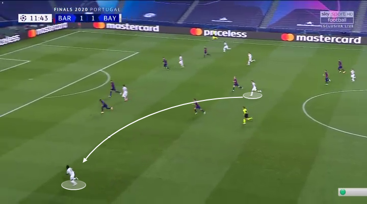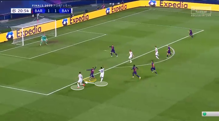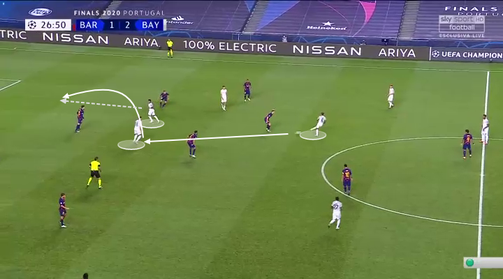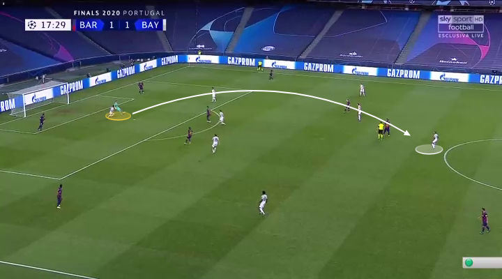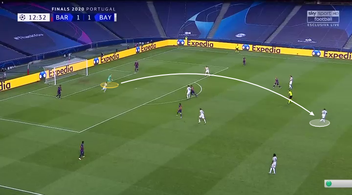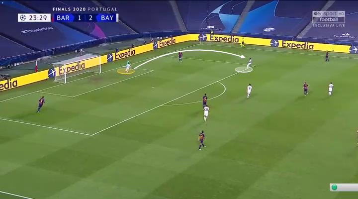 لكنها رائعة في المقام الأول من بايرن - تمريرة بدون نظرة من تياجو ، ولمسة رائعة من جوريتزكا وركض في توقيت مثالي خلف لينجليه من جنابري. هذا النوع من التمريرات ، من خط الوسط ، إلى مهاجم يسقط بعمق ، والذي يلعب تمريرة ذكية في الخلف كانت خطوة كلاسيكية لبرشلونة في أيام جوارديولا.