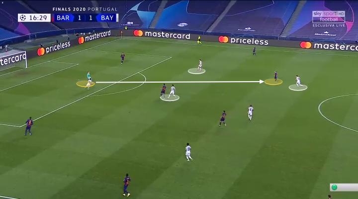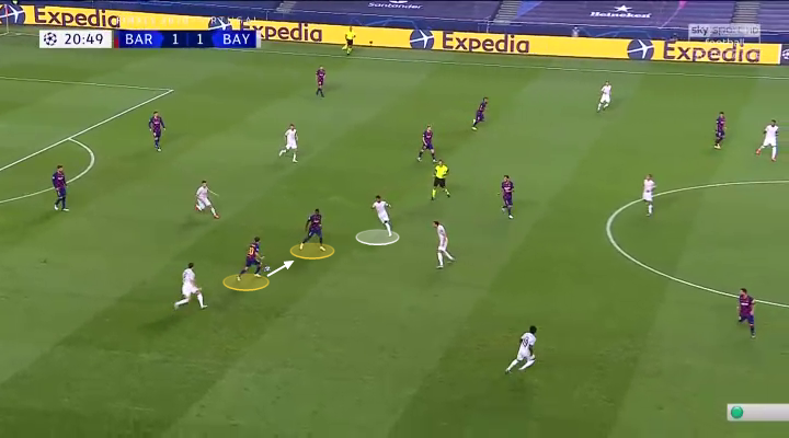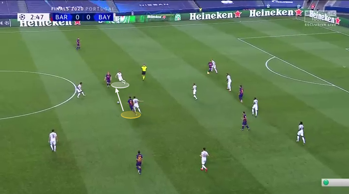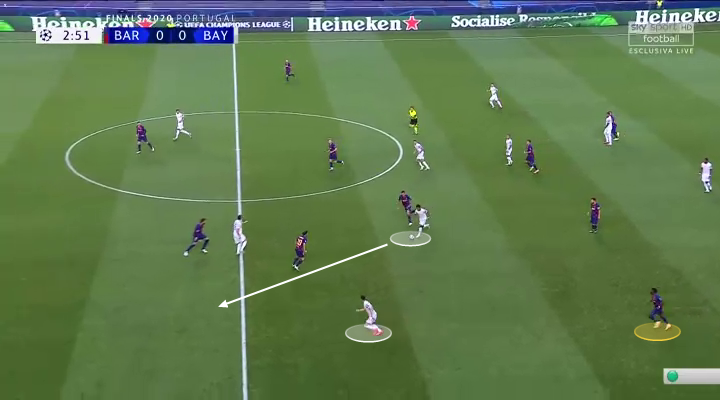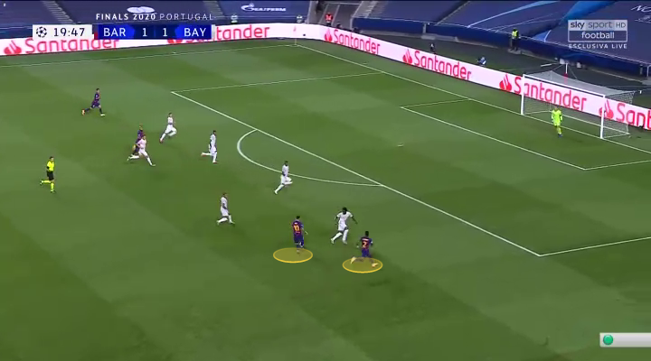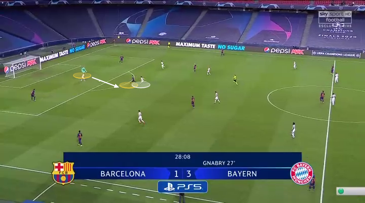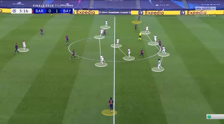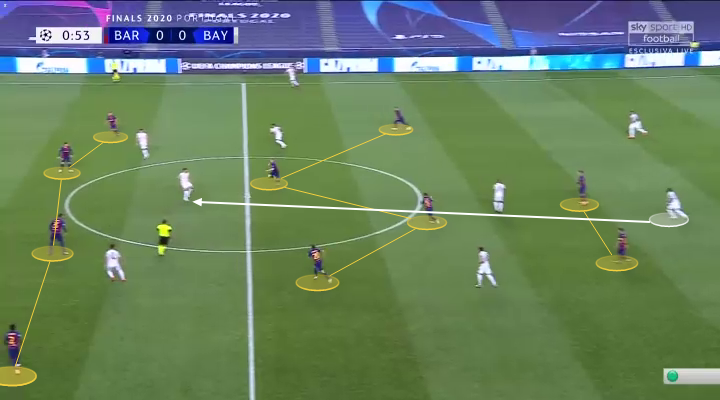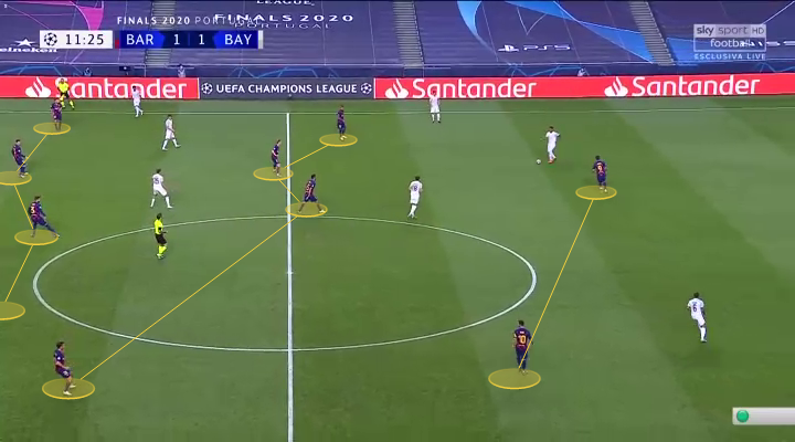 باستثناء ليفاندوفسكي ، فإن اللاعبين التسعة الآخرين يستخدمون دائرة قطرها 20 ياردة يغطون مسافة رأسية لا تزيد عن 15 ياردة. هناك ثغرة مفادها أن بايرن أعطى برشلونة بالفعل مساحة كبيرة لاقتحامها - وهذا يظهر بدقة إلى أي مدى كان الظهيران نيلسون سيميدو وجوردي ألبا قادرين على اللعب بسهولة.