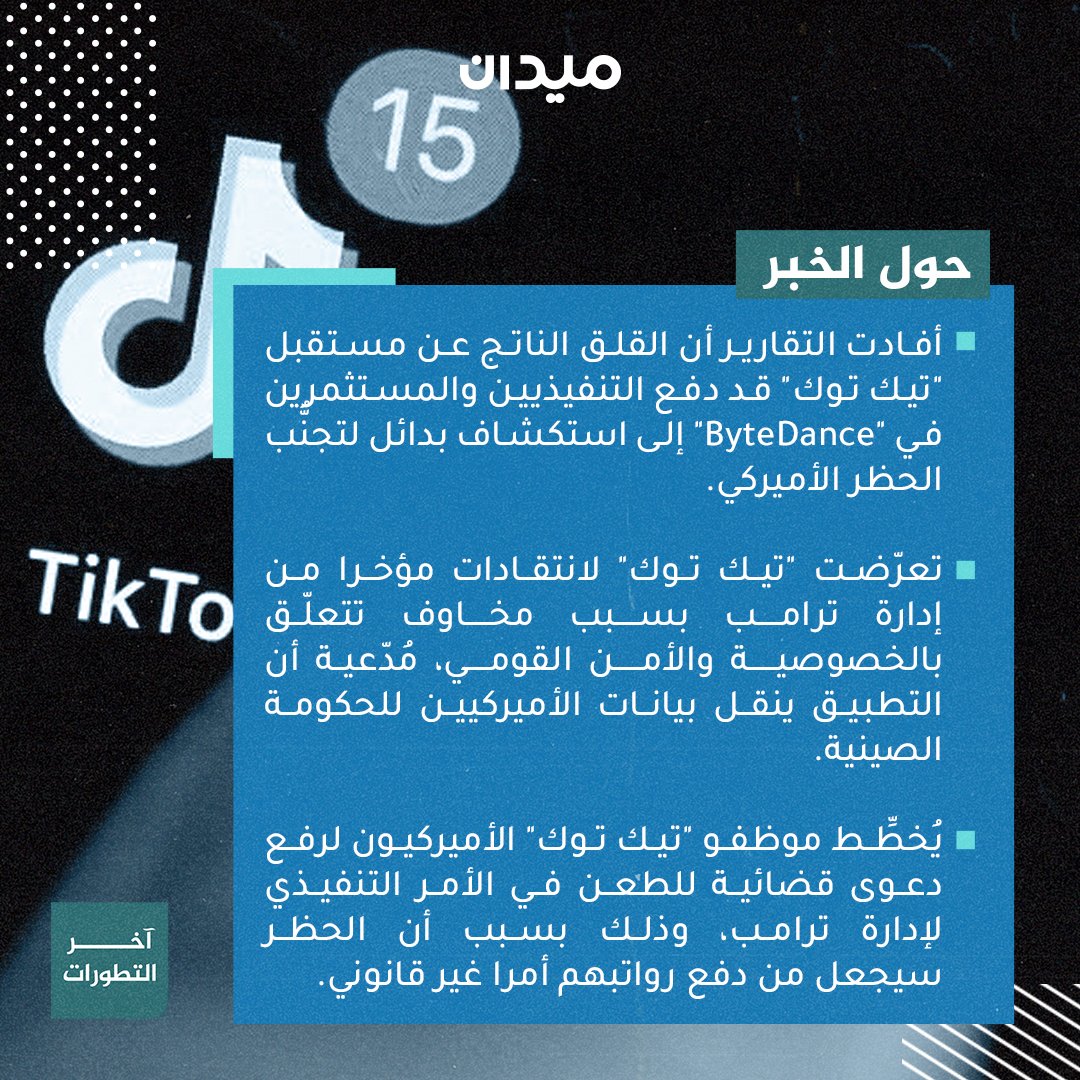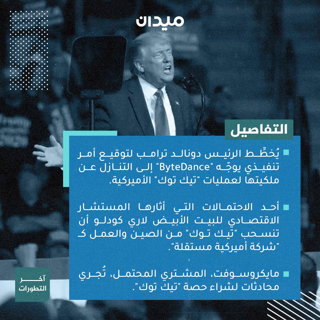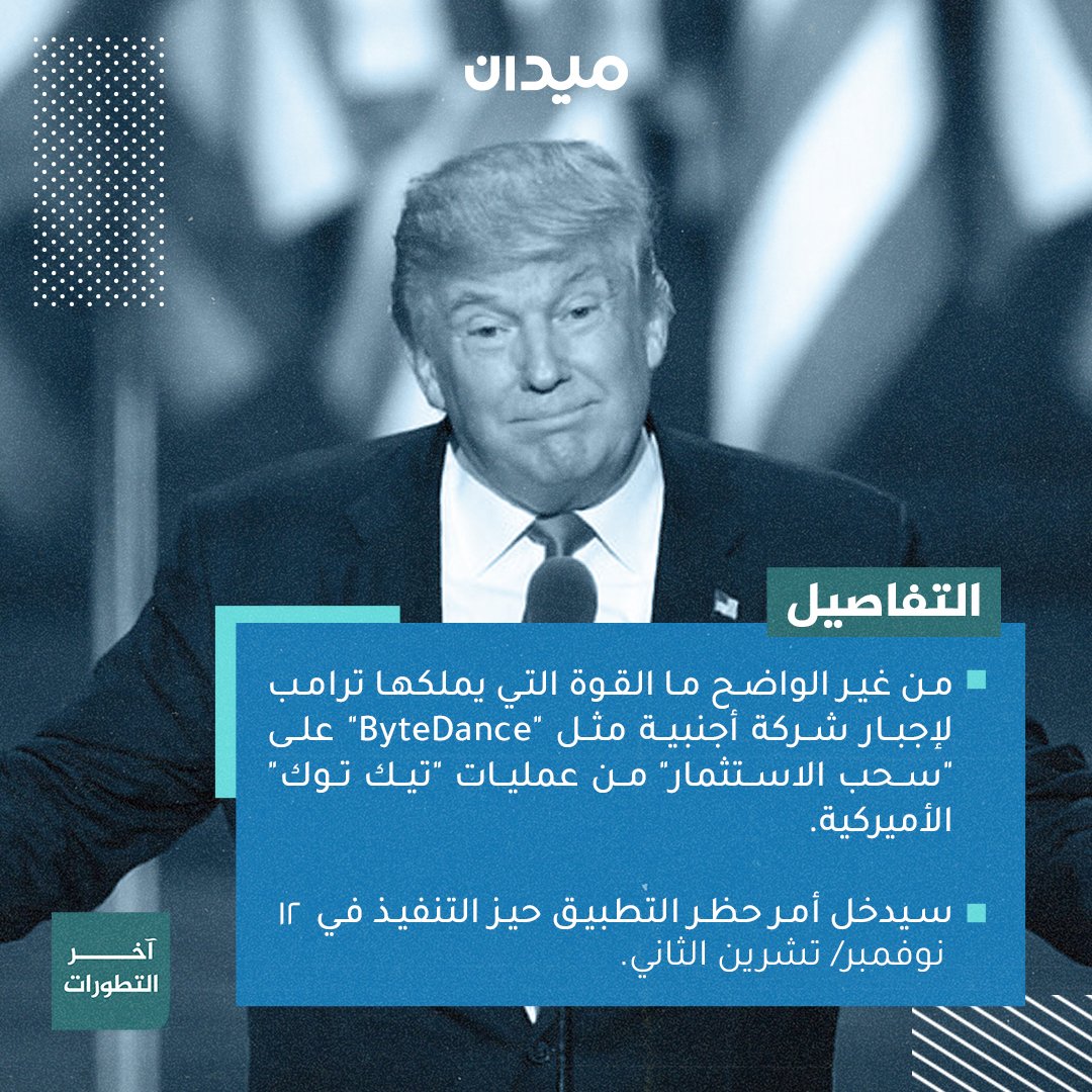 #ترامب يمنح شركة "بايت دانس" (Byte Dance) المالكة لتطبيق تيك توك مهلة جديدة حتى 12 نوفمبر / تشرين الثاني لبيع أو فصل أعمال تطبيق " #تيك_توك " في الولايات المتحدة، فهل تسفر هذه المهلة عن أي جديد؟، إليك ملخص آخر التطورات: