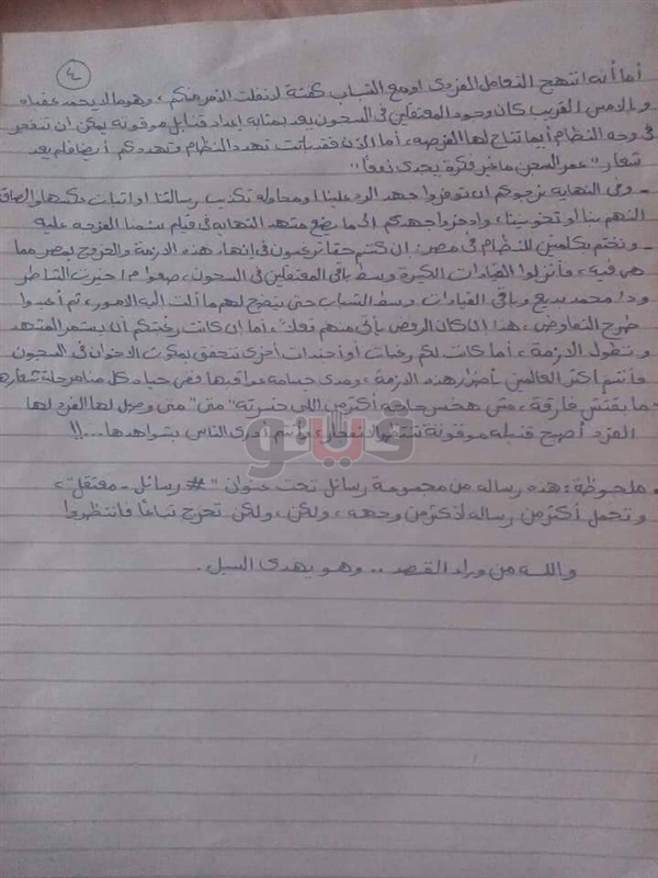 نحن شباب المعتقلات إخوانًا وغير إخوان، ندعو جميع قيادات جماعة الإخوان المسلمين داخل وخارج سجون وحدود مصر، أن يتحركوا بكل ما أوتوا من قوة تجاه حل لأزمتهم مع الدولة في مصر، وأن لا يترددوا في أخذ خطوة للوراء تحفظ لهم ما تبقى من بقايا جماعة وتحفظ عليهم القليل القليل ممن تبقى من شبابه
