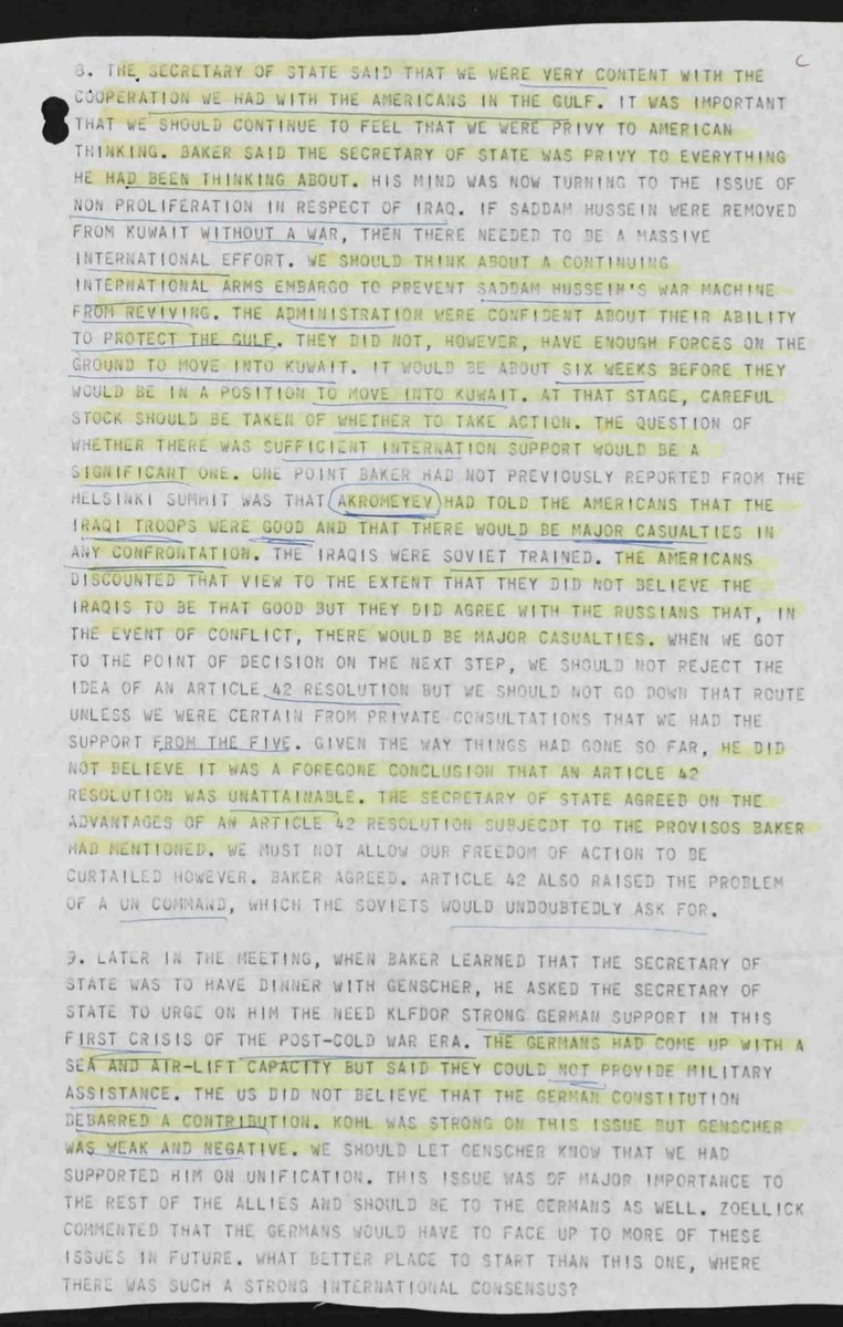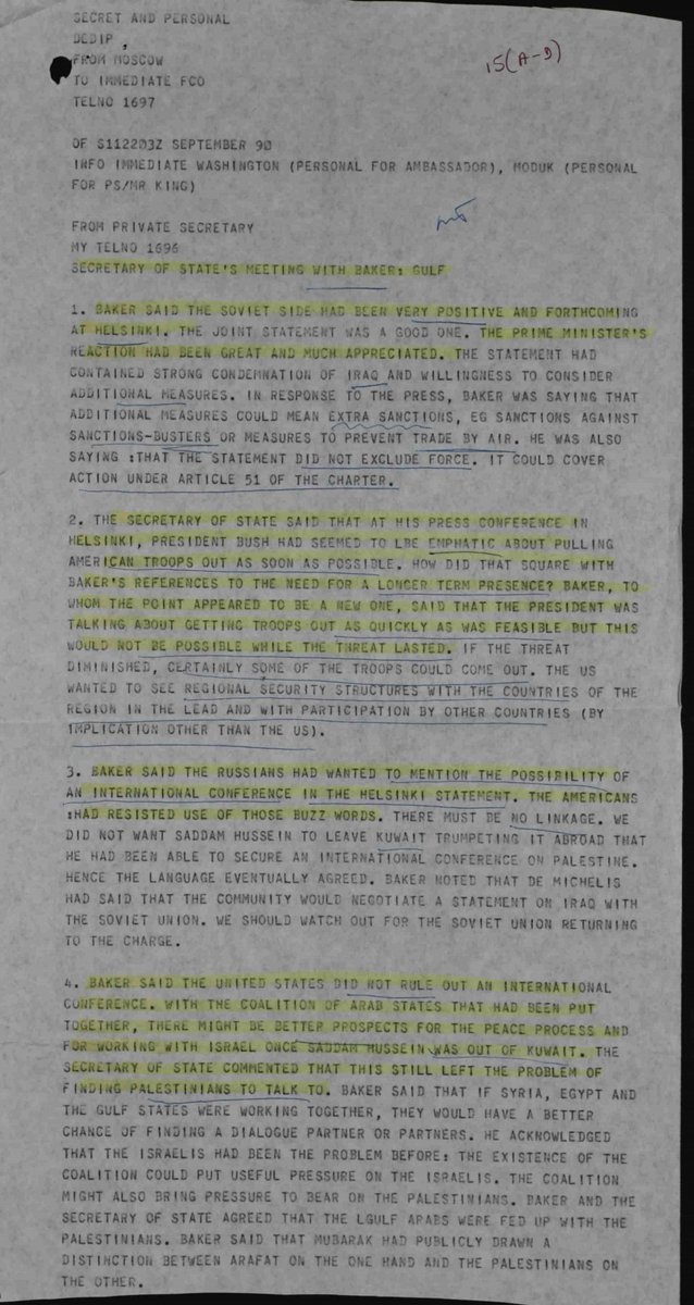 🛑٣ بيكر يقول ان الروس اقترحوا قيام مؤتمر دولي بعد تصريح هلسنكي والجانب الامريكي رفض بشدة كي لا يجد #صدام_حسين فرصة للانسحاب تحت غطاء ان القضية الفلسطينية سيتم تداولها .. يجب فصل الملفين تماما وعدم السماح للروس باي هامش للتحرك